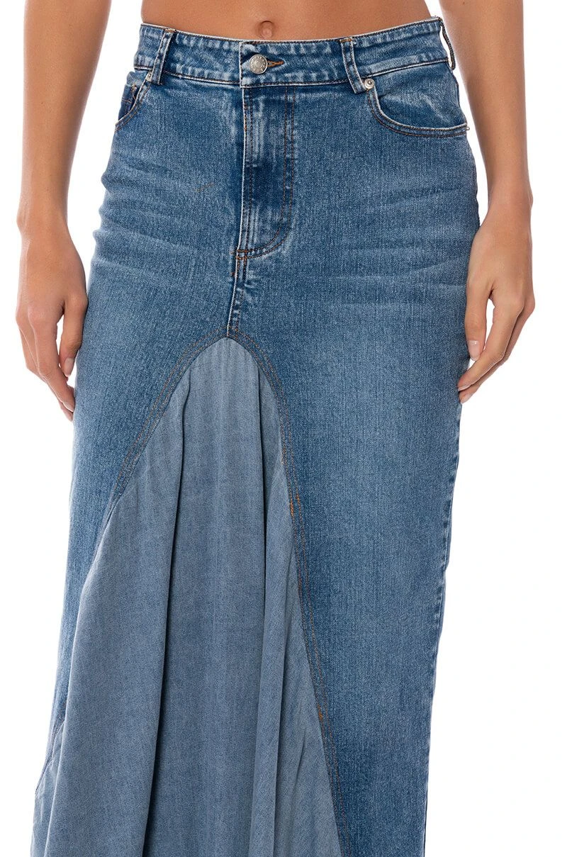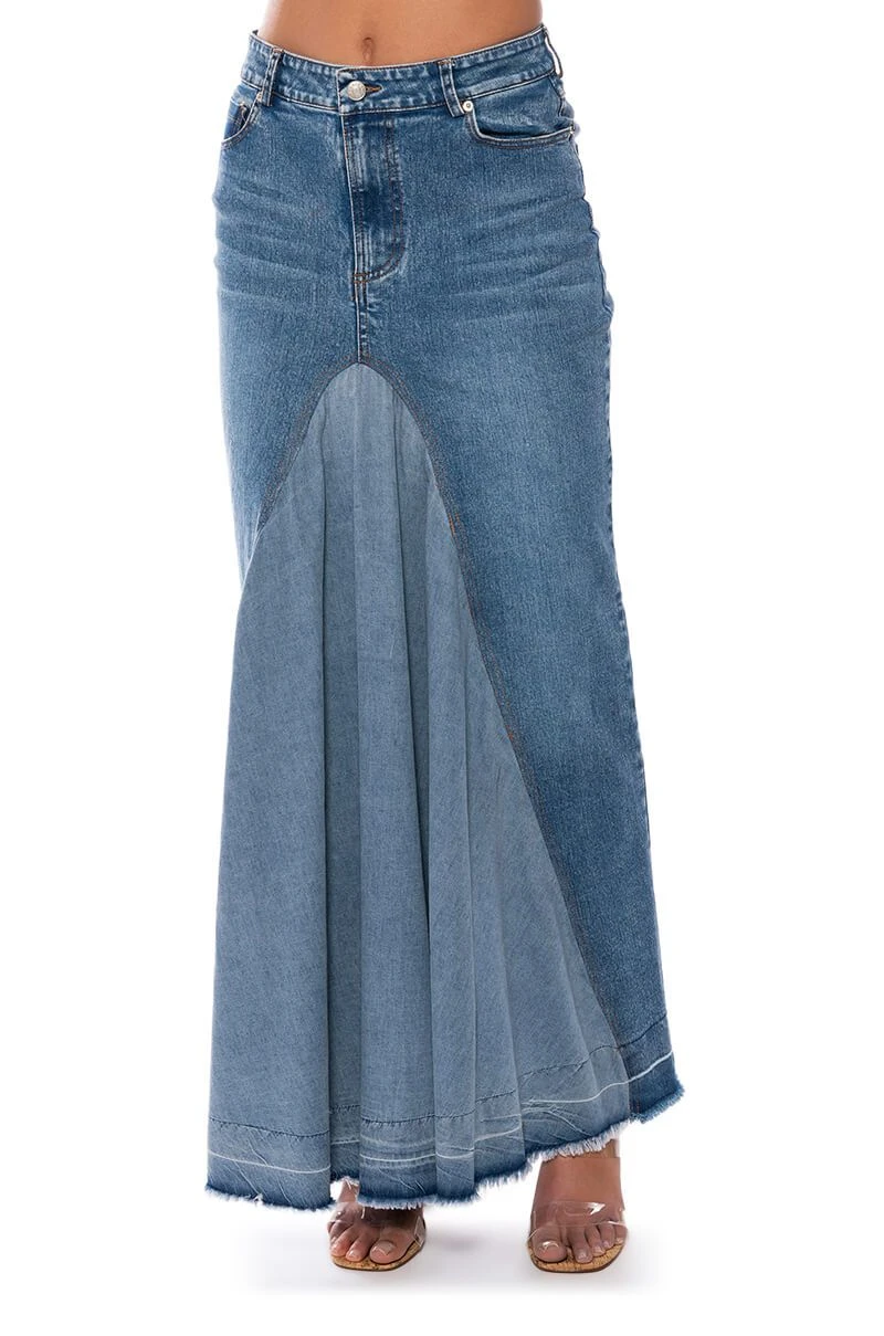 The AKIRA Label Added Flare Front Pleat Maxi Skirt is made from a denim base fabrication and features a high waist, a classic 5-pocket design, a unique, flared front pleat detail, and a maxi length. Complete with a raw cut bottom hem and a pull-on fit. Style with a bodysuit, bolero, and chunky platform boots for a finished look.