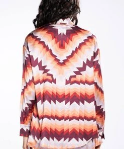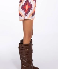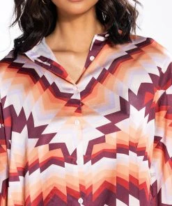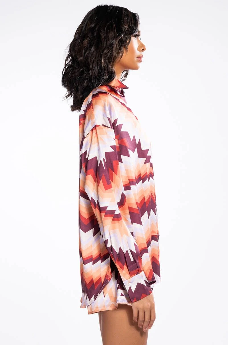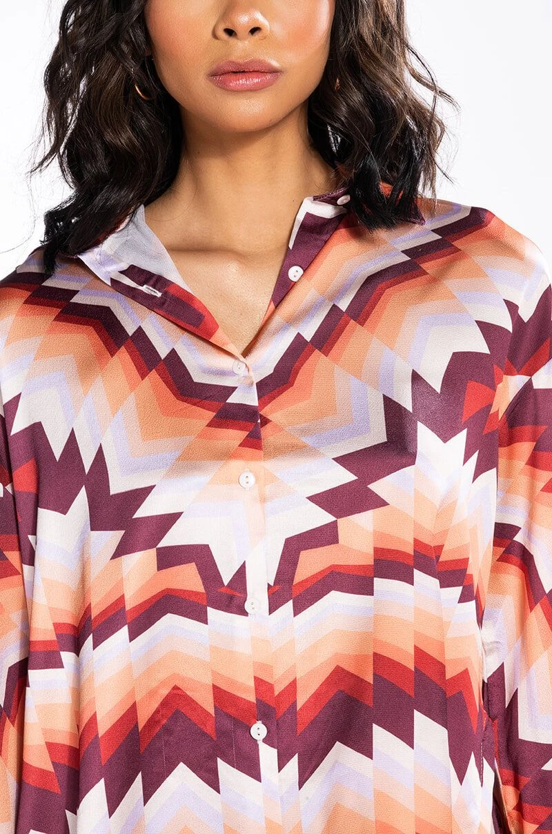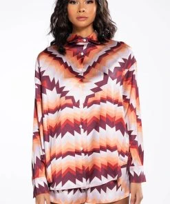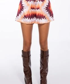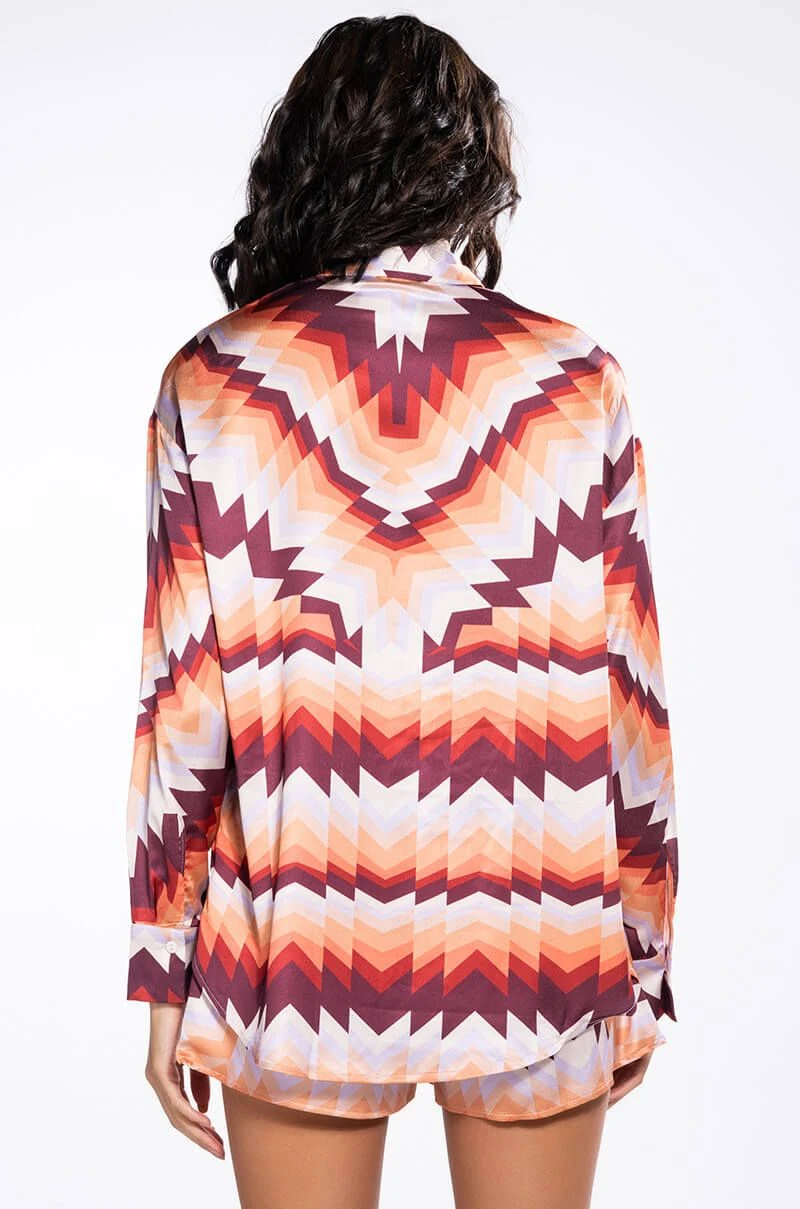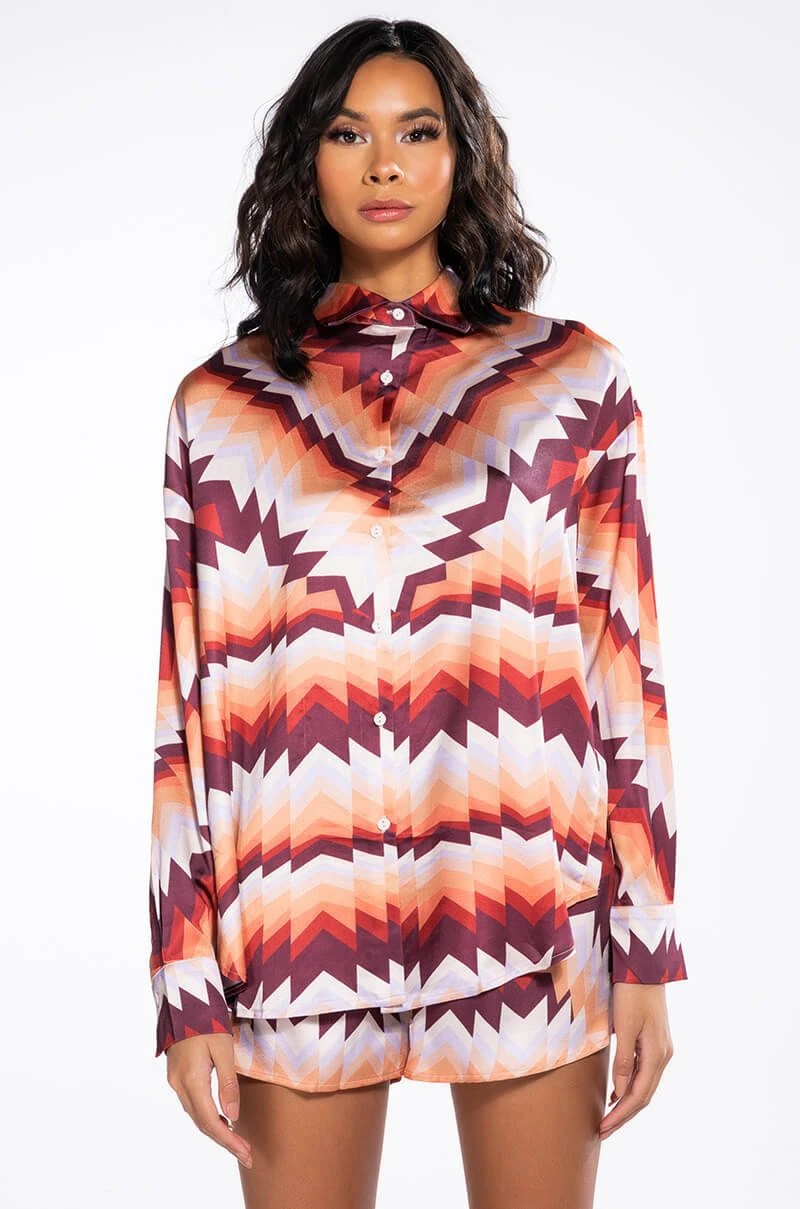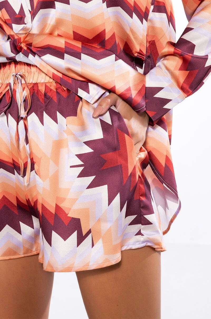 The AKIRA Label Adventurer Loose Fit Button Up And Shorts Set is made from a textured, lightweight fabrication with a multicolor, Western-inspired star print and features: a loose fit button up shirt with a pointed collar neckline, long sleeves with buttoned cuffs, split hems, and a button up front closure. Also included is a pair of loose fit shorts with a high rise waist, a ruched drawstring waistband, and side pockets.