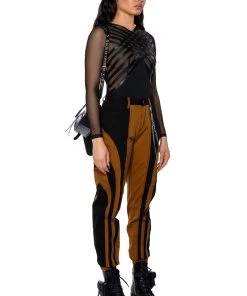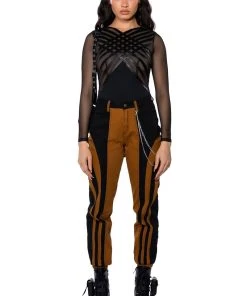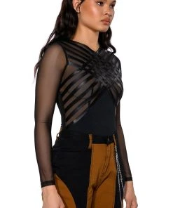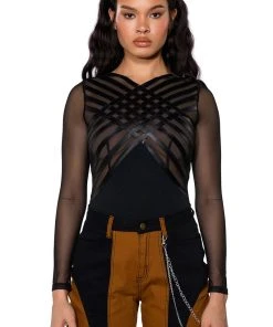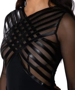 Cut the lights and turn up the heat. The AKIRA Label After Dark Faux Leather Panel Long Sleeve Mesh Bodysuit is an ultra-sexy sheer top featuring a mesh base, long sleeves, a high cross front neckline, and a thong bottom fit. Complete with a snap gusset fastening and faux leather panel detailing across the chest. Complete your look with straight leg leather pants.