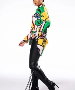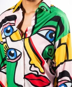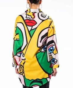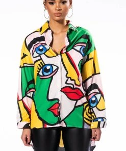 Give them something to look at with The AKIRA Label All Eyes On You Button Down Blouse! This bold piece is made from a lightweight cotton shirt fabrication and features an artsy faces print, a pointed collar, long sleeves with cuffed wrists, a rounded hem, mini length silhouette, and a button down front closure. Pair this piece with thigh high boots, denim, and a moto jacket to complete your graphic look.