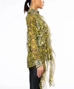 The AKIRA Label Pure Love Asymmetrical Ruffle Button Down Blouse is made from a sheer, lightweight fabrication and features a clustered text and heart print, a collared neckline, long sleeves with buttoned cuffs, a boxy silhouette, and extended asymmetrical ruffle detailing on the right side. Complete with a button down front closure. Pair this piece with leather-look leggings and platform booties to complete your look.