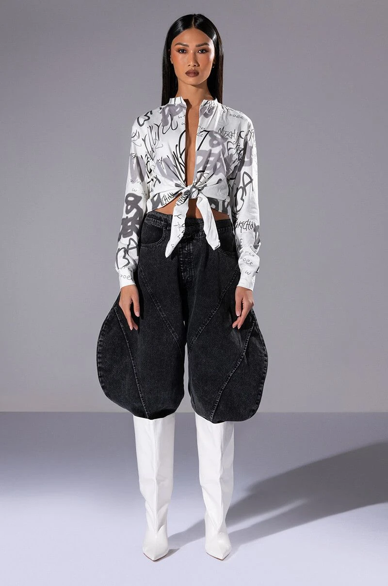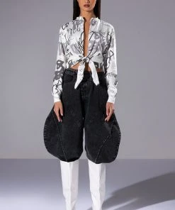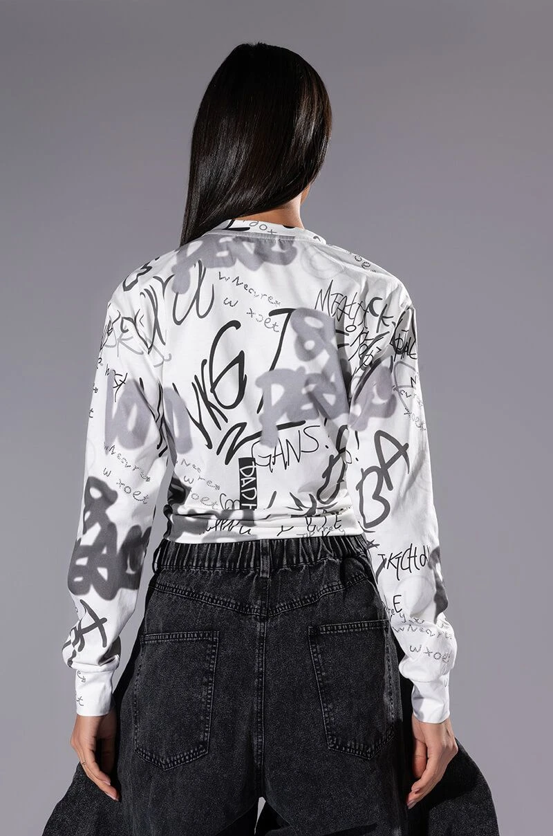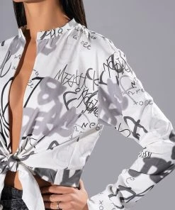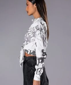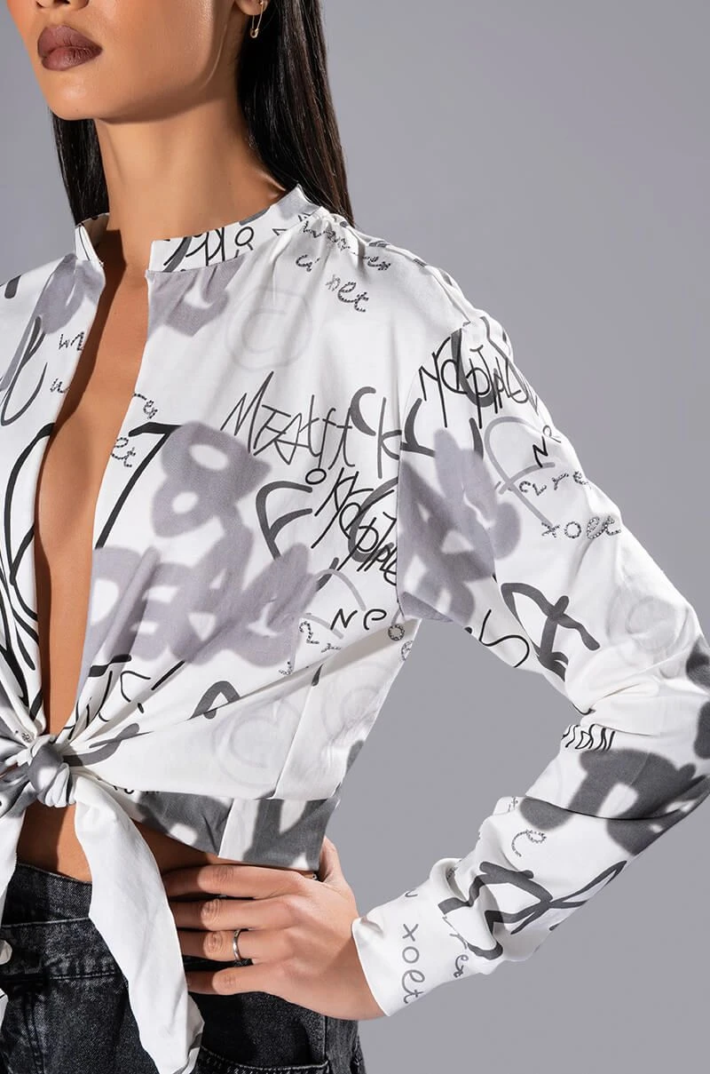 Keep them second guessing with The AKIRA Label Always In Style Tie Front Tshirt! This top is a soft cotton tee featuring a plunging neckline, long sleeves with ribbed cuffs, and a tie front silhouette. Complete with allover graffiti style text print and rhinestone embellished text patterning. Pair with relaxed denim and strappy heels for a sexy day out look!