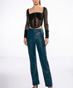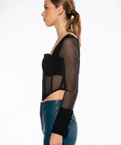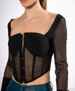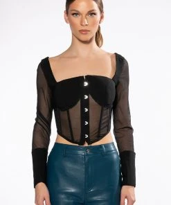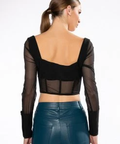 The AKIRA Label Always Yours Long Sleeve Structured Top features a smooth, blazer-like fabrication, long sheer mesh sleeves, oversized button cuffs, and a point hem cropped cut. Complete with a sweetheart neckline, padded bust cups, a sheer mesh bodice, boning for structure, and hook and eye front closures.