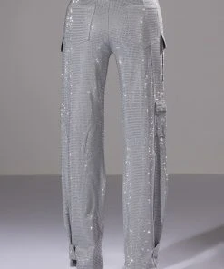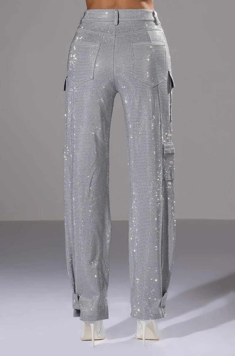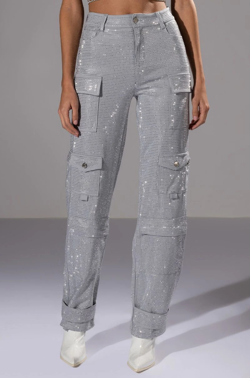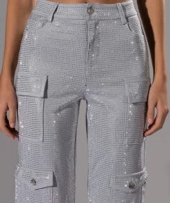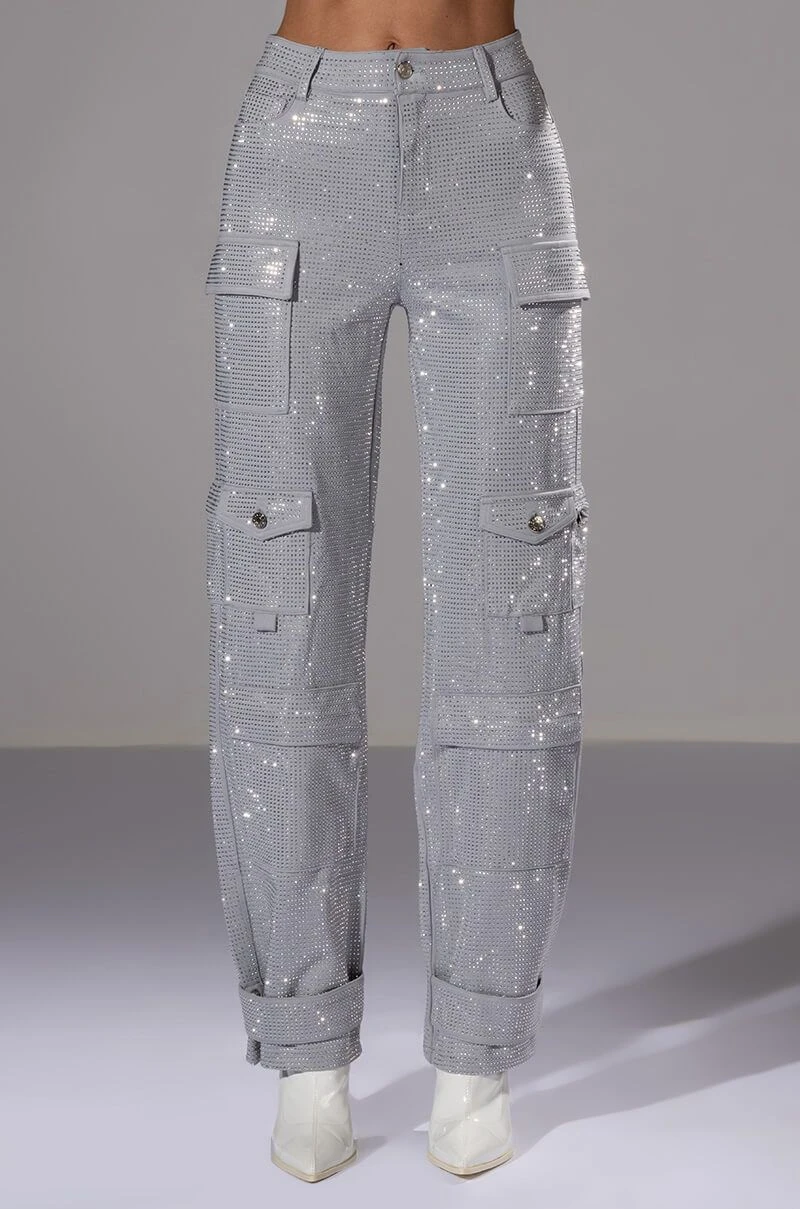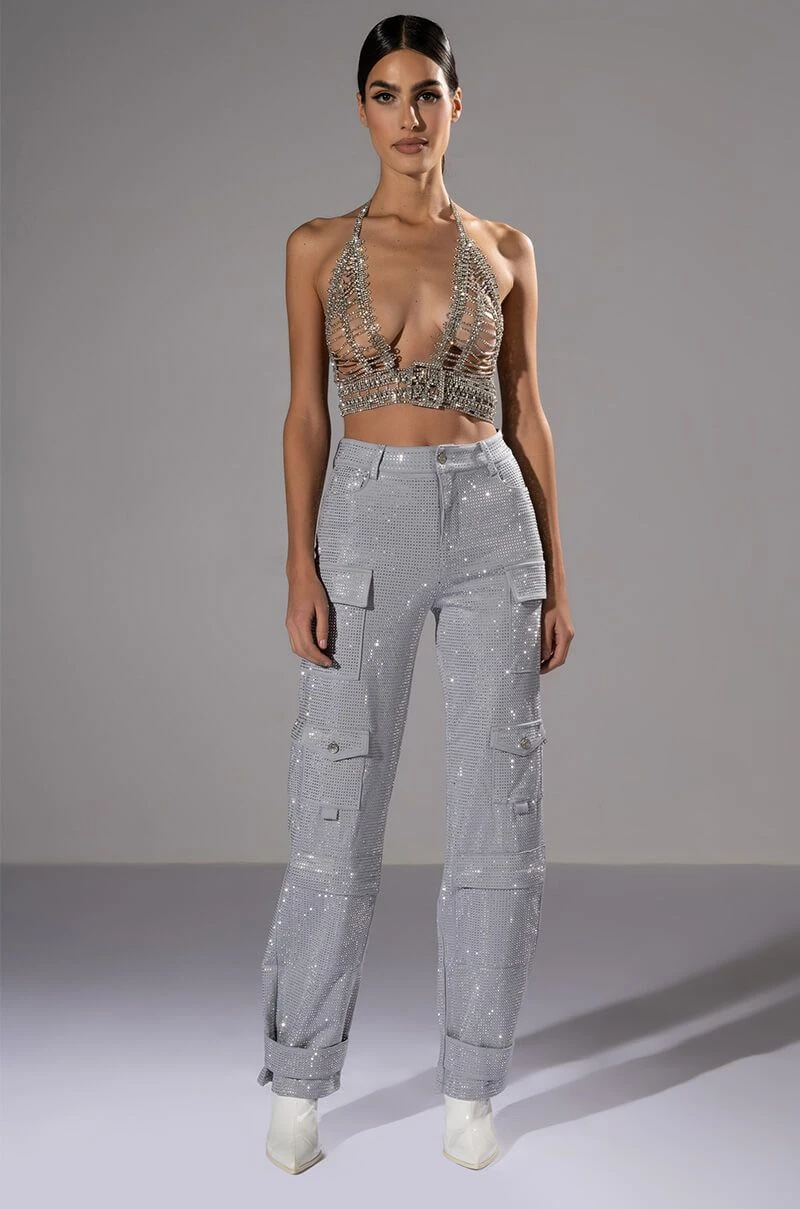 The AMMO Bonne Soiree Rhinestone Cargo Pants are made from a stretchy, cargo pant fabrication and features an all over rhinestone studded design, high rise waist, and classic zip-up button front closure. Complete with patch pockets, zipper cargo pockets, working back pockets, and a straight leg silhouette with adjustable snap closure at the hems. Pair with your fave cropped tee and booties for your effortless soiree look!