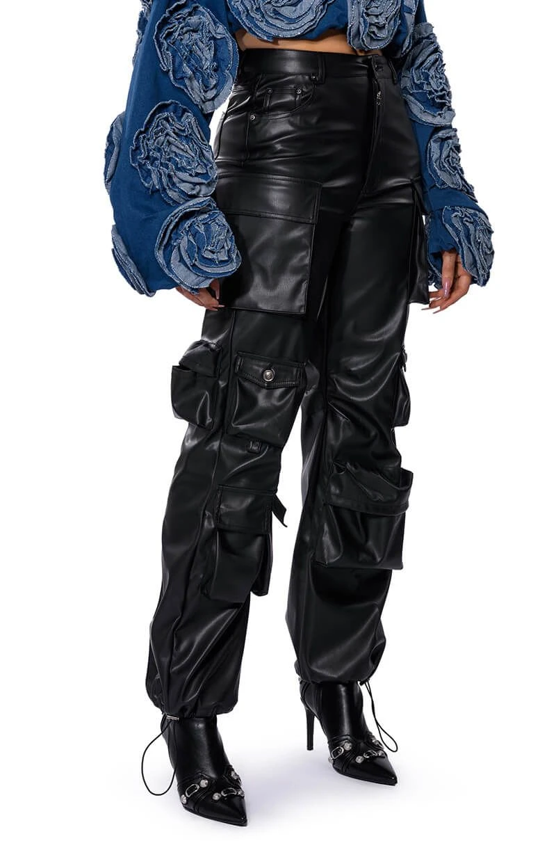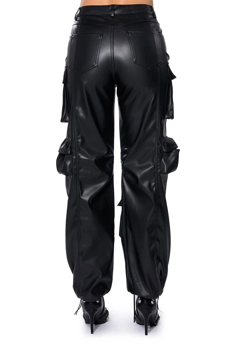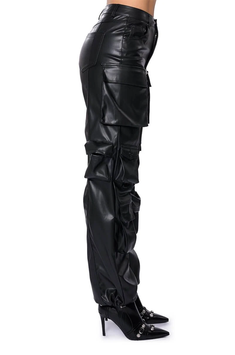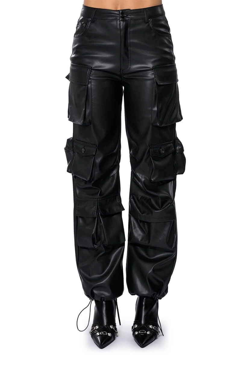 Strike a pose! The AKIRA Label Basically A Model PU Cargo Pant is made from a pebbled faux leather fabrication and features a high rise waist, belt loops, a classic five-pocket design, cargo flap and button flap pockets along the legs, a straight leg silhouette, toggle drawstring ankle hems, and a button and zipper front closure.