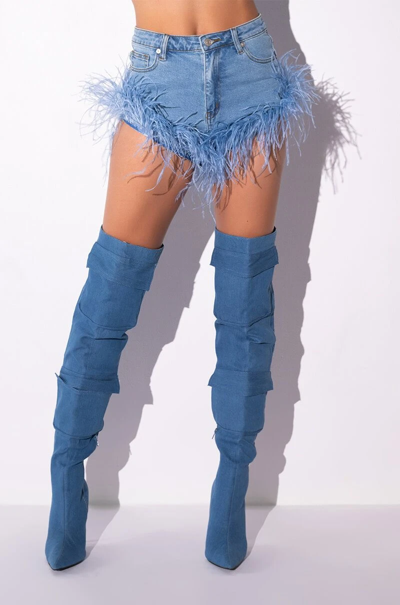 The AKIRA Label Big Energy Feather Jean Short is a fresh denim piece featuring real feather fringe, a high rise waist, a five pocket design, working belt loops, a cheeky high cut silhouette, and a classic button and zipper closure.