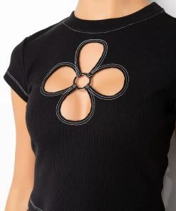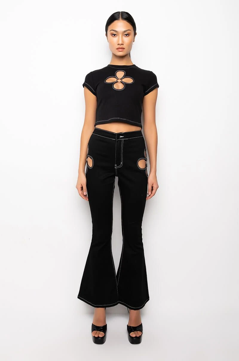 Bloom like the flower you are in The AKIRA Label Blossom Cut Out Short Sleeve Tee Shirt. This piece features a classic crew neckline, a slightly cropped cut, contrast stitch detailing, short sleeves, and flower-like cut outs with silver metallic o-ring detailing at the front and back. This stretchy tee will look extra fabulous with the coordinating AKIRA Label Blossom Cut Out Detail Flare Jean.