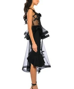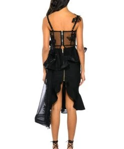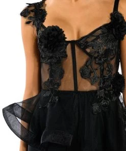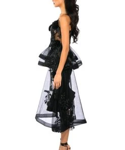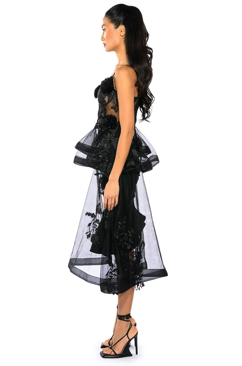 The AKIRA Label Camilla Floral Embroidered High Low Peplum Top features a luxurious mesh base fabrication, a sweetheart neckline with adjustable tank straps, and an asymmetrical peplum hemline. Complete with embroidered floral details and ruffled flower appliques, a corset bodice with boning for structure, a side high-low train silhouette, and an exposed silver metallic back zipper closure. Pair with skinny fit trousers and pumps for a chic, complete look.