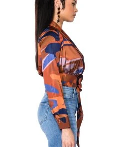 The AKIRA Label Casablanca Satin Printed Blouse is giving us date night on the beach vibes. Made from a luxe, satin base fabrication this ultra chic top features an abstract print design, a plunging neckline, foldover collar, and long sleeves with buttoned cuffs. Complete with a snap buttoned, self-tie side wrap closure. Style with denim jeans and stiletto booties for that effortlessly sexy look.