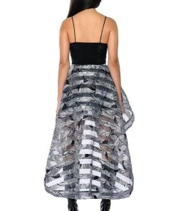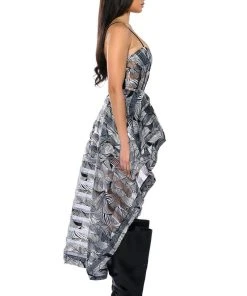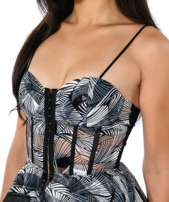 The AKIRA Label Made For You High Low Corset Top is a floaty, feminine number featuring a corset bodice, padded bust cups, slim tank straps, a sweetheart neckline, contrast seam detailing, satin faux pocket accents, and boning for structure. Complete with a sheer organza base, a dramatic, cascading high low silhouette, graphic print patterning, tulle inner lining, a reinforced hemline, hook and eye front closures, and a smocked mesh back. Pairs perfectly with pointy toe pumps and trousers.