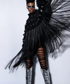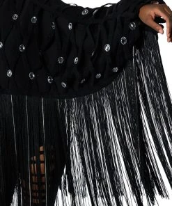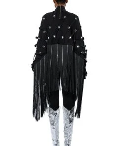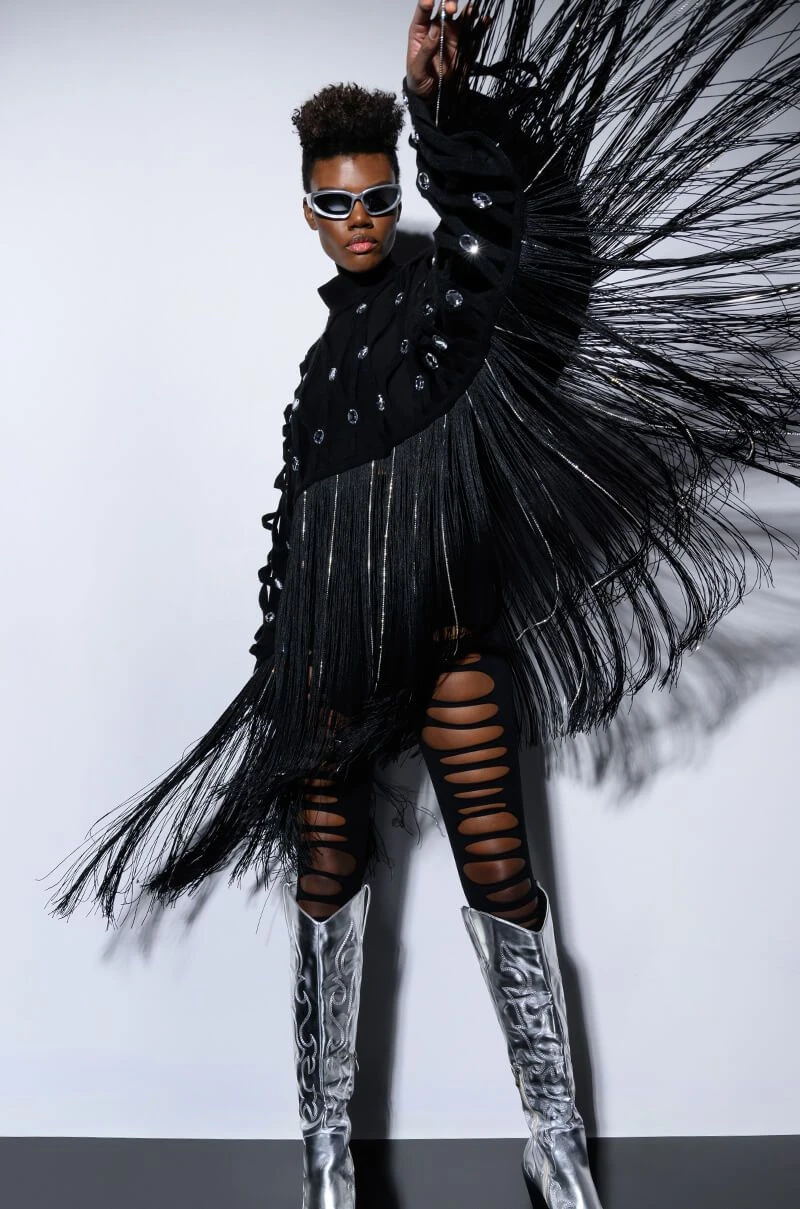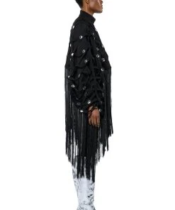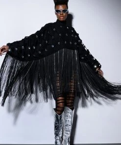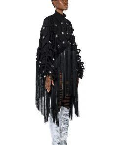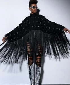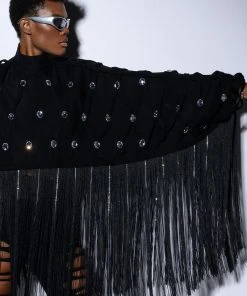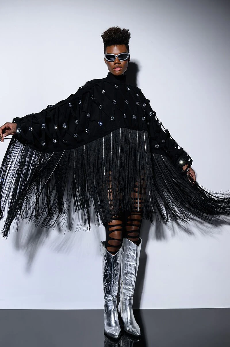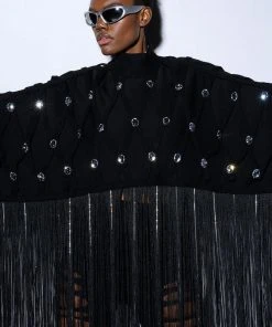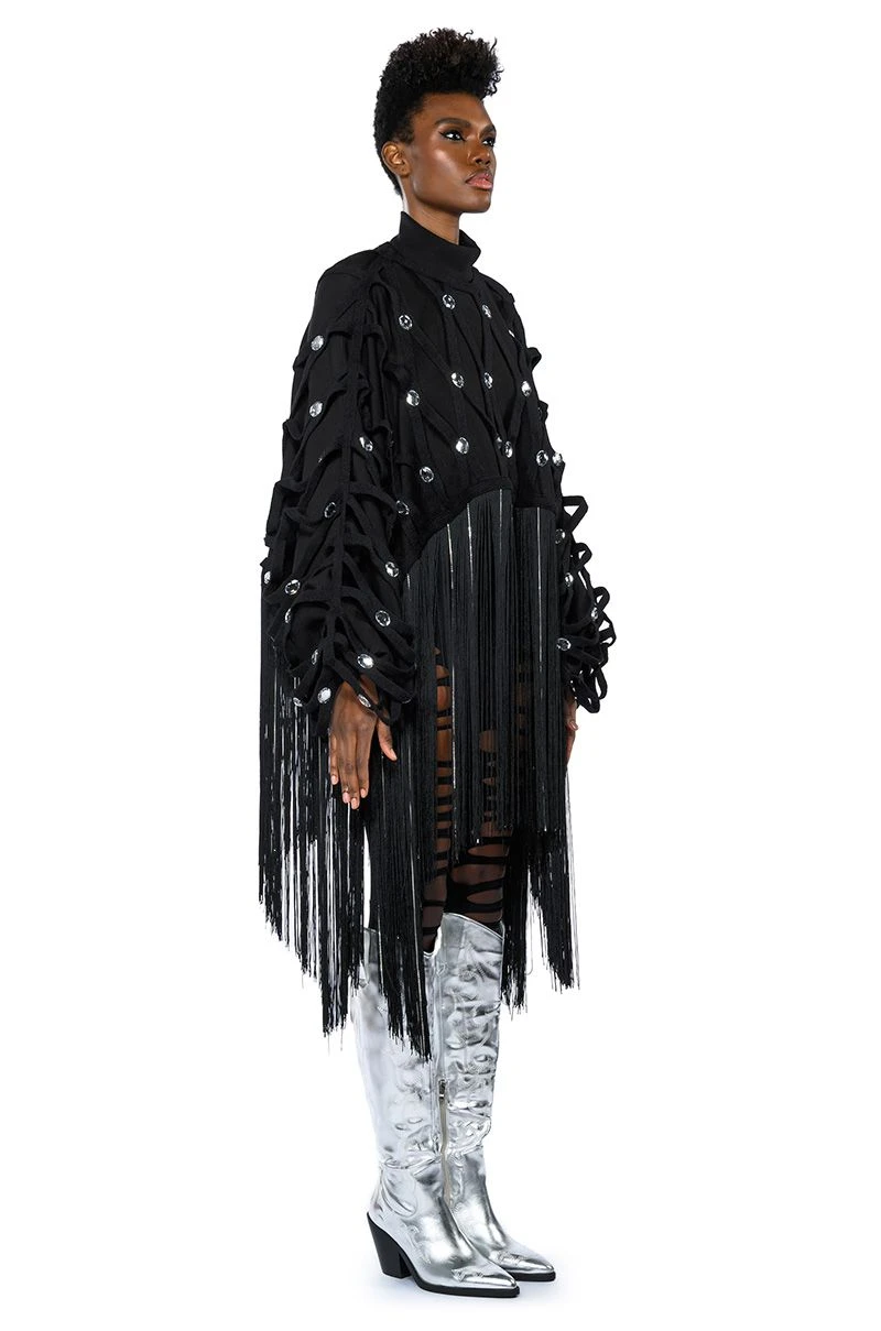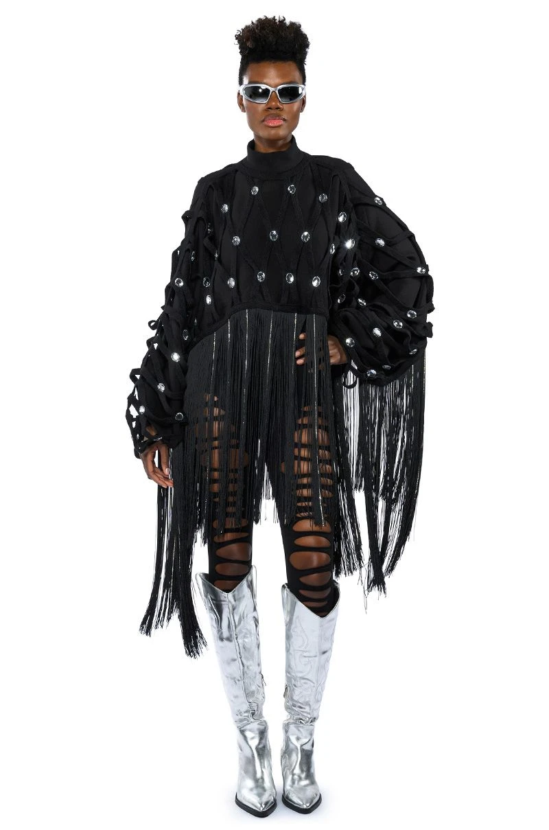 The AKIRA Label City Livin Fringe Sweatshirt is made from a soft knit fabrication and features a standing collar, long, poncho-like sleeves with snap button cuffs, a knit, webbed top layer with gem detailing, a cropped silhouette, a long rhinestone link fringe hem, and a quarter zip front closure.
