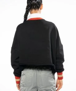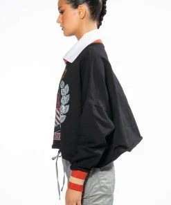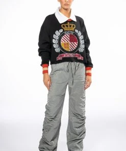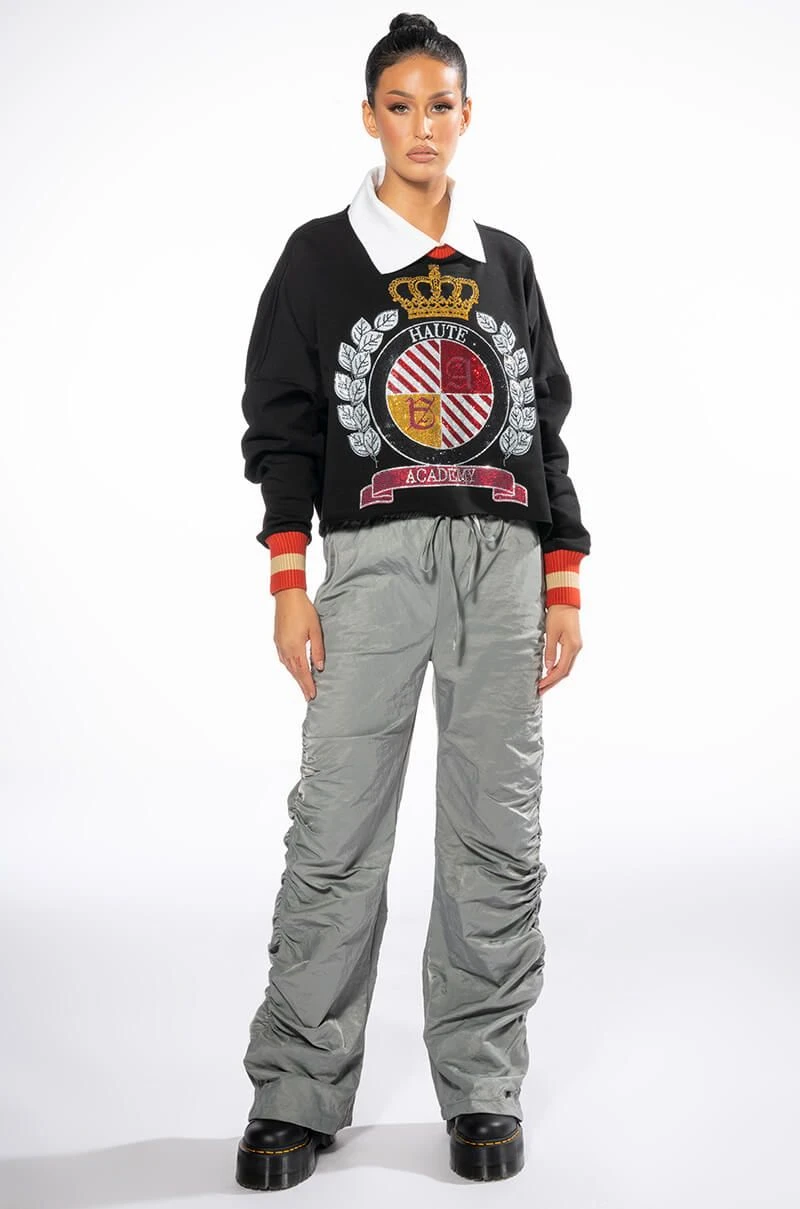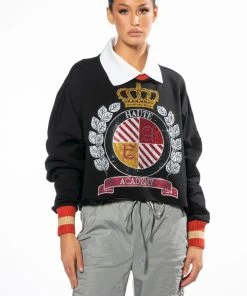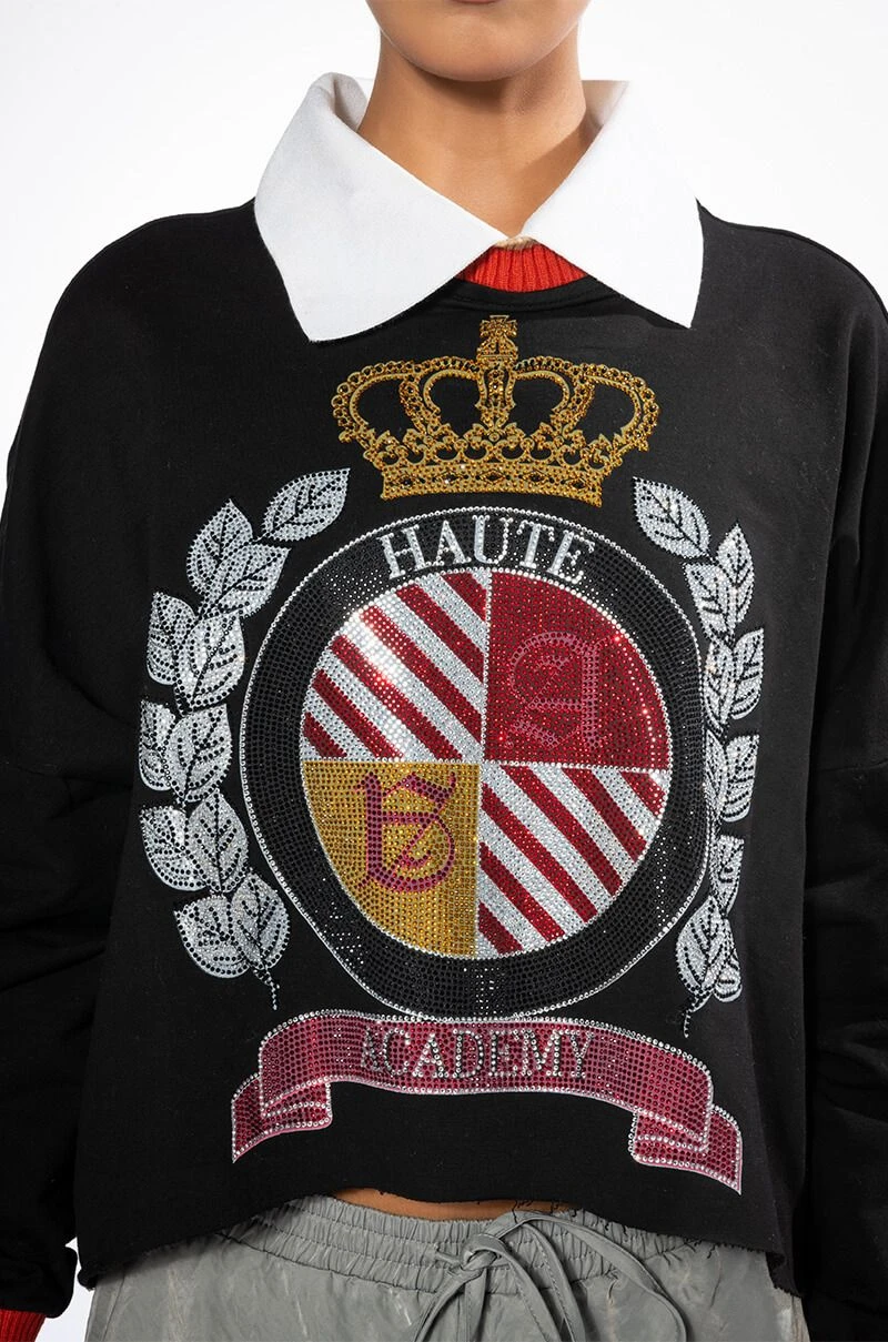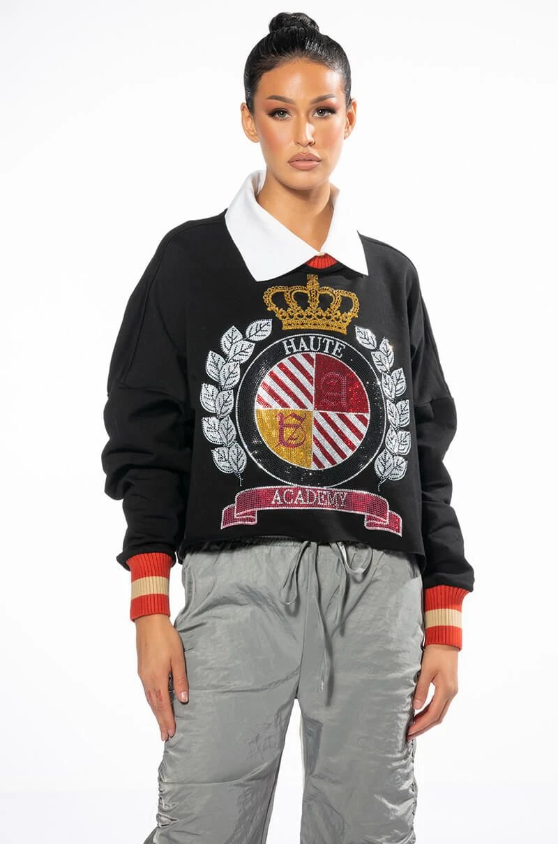 The AKIRA Label Collegiate Haute Academy Collared Sweatshirt is a cozy, cute sweater featuring a smooth knit fabrication, long sleeves, ribbed knit cuffs, a raw hem cropped cut, and a contrast collared neckline. Complete with a rhinestone embellished “Haute Academy,” collegiate logo graphic.