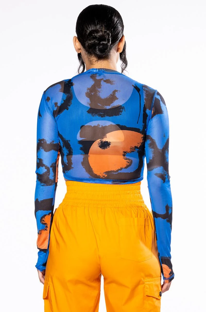 The Akira Label Colors Of The Wind Long Sleeve Crew Neck Mesh Crop is a sheer top featuring an abstract graphic print with mesh fabrication, a cropped design, crew neckline, and long sleeves with thumbholes. Style this top with a pair of leather pants and booties for the full cyber-chic fantasy!