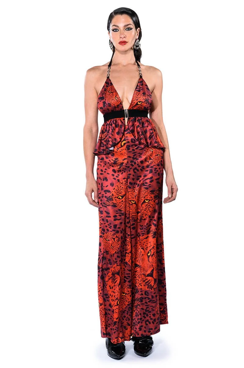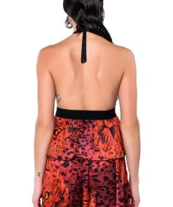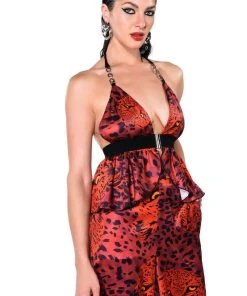 The AKIRA Label Craving Your Attention Halter Top is made from a soft satin fabrication and features a fierce cheetah print with floating cheetah heads, a tie halter with embellished chain detailing, a plunging neckline, a wide, buckled elastic waistband, a sexy open back, and a rounded, peplum-like hem. Pair this piece with the matching AKIRA Label Craving Your Attention Wide Leg Pants to keep all eyes on you.