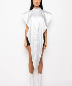 The AKIRA Label Desire Maxi Button Up Blouse features a sleeveless silhouette, wide shoulder details, a button up front, an inner cropped tank, an extended front detail, and a collared neckline.