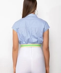 The AKIRA Label Dirty Martini Cropped Short Sleeve Poplin Blouse is made from a classic cotton shirt fabrication and is complete with a collared neckline, cap sleeves, striped pattern, a chest patch pocket, a thick multicolor elastic waistband, cropped silhouette, and a button up front closure. Pair this piece with flared bottoms for a flirty cocktail hour look!
