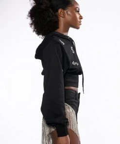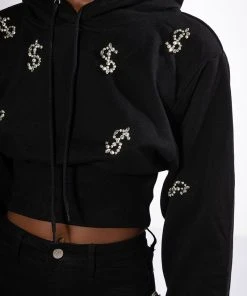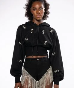 The AKIRA Label Dollars On My Mind Cropped Rhinestone Sweatshirt features an attached drawstring hood, long sleeves with cuffed wrists, a cropped silhouette, and ribbed knit hems. Complete with front rhinestone-detailed dollar sign patterning.