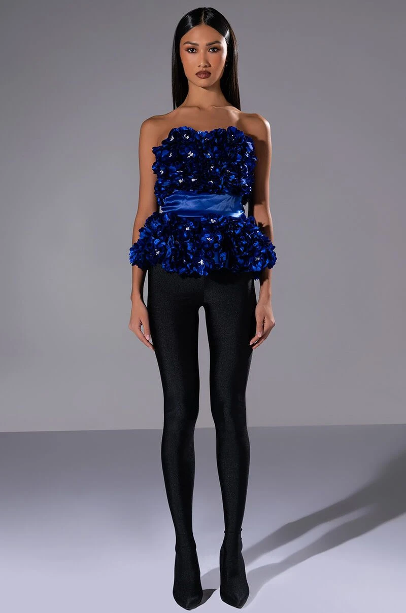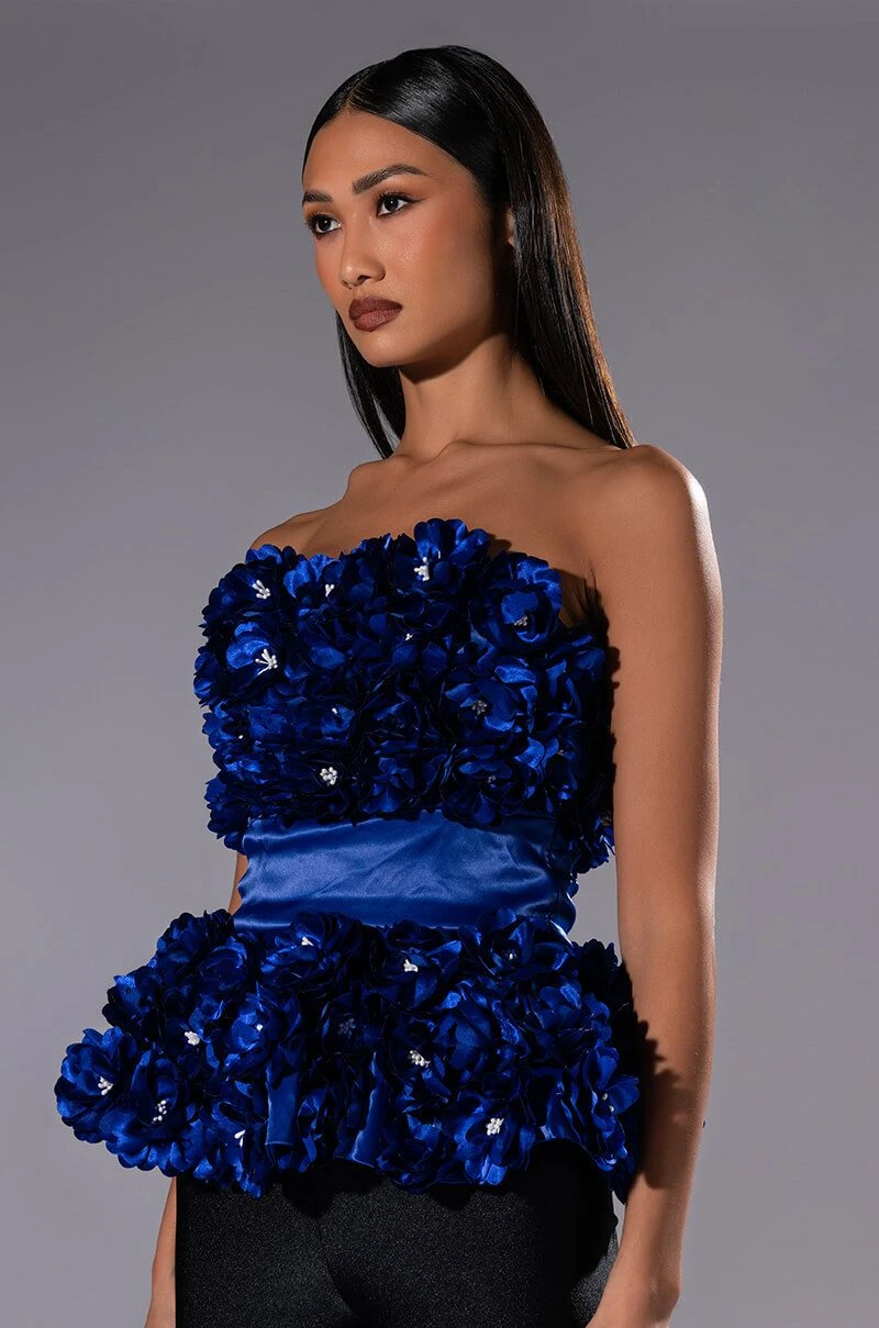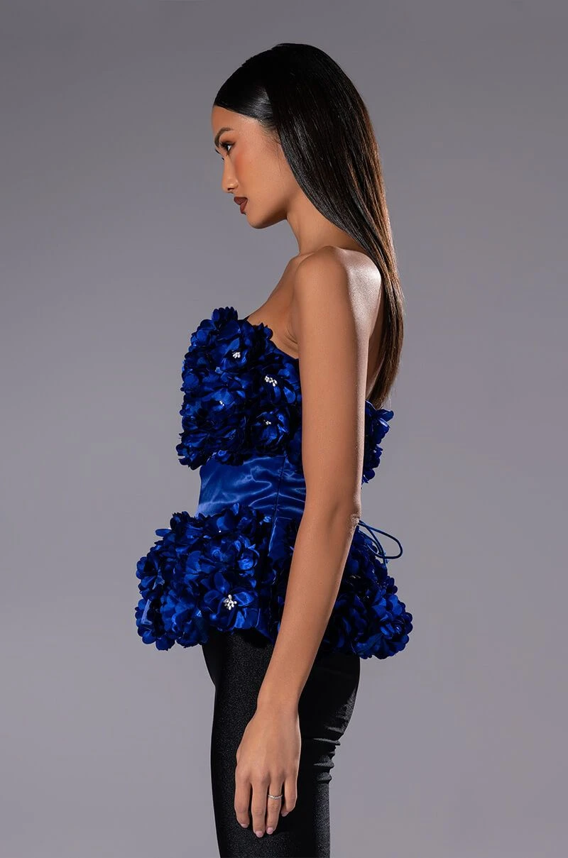 The AKIRA Label Emilia Floral Applique Strapless Top is made from a luxe satin fabrication and features a strapless neckline, a lace-up back, a reinforced peplum hem, and a tonal side zipper closure. Complete with 3D floral applique paneling along the chest and hem.