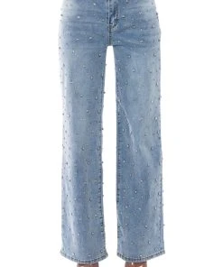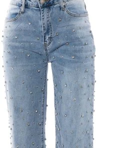 A pair of jeans fit for every occasion. The AKIRA Label Everytime Rhinestone Embellished Straight Leg Jeans feature a stretch denim fabrication, a high rise waist, functional belt loops, a classic five-pocket design, a straight leg silhouette, rhinestone gemstone detailing throughout, and a button and zipper closure. Style with a sleek halter top and PVC pumps for a complete look.