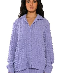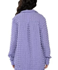 Live out loud with The AKIRA Label Existing Loudly Textured Button Down Top. This piece features an unlined popcorn textured fabrication, a foldover collar, long sleeves with buttoned cuffs at the wrist, and an oversized silhouette. Complete with double front pockets, rounded hems, and a button down front closure. Style this top with fur boots and the coordinating AKIRA Label Existing Loudly Textured Jogger for a cozy, effortless look!
