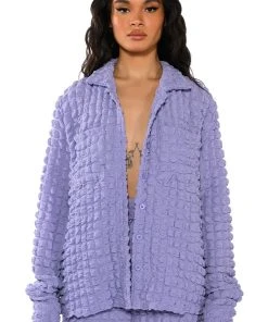 Live out loud with The AKIRA Label Existing Loudly Textured Button Down Top. This piece features an unlined popcorn textured fabrication, a foldover collar, long sleeves with buttoned cuffs at the wrist, and an oversized silhouette. Complete with double front pockets, rounded hems, and a button down front closure. Style this top with fur boots and the coordinating AKIRA Label Existing Loudly Textured Jogger for a cozy, effortless look!