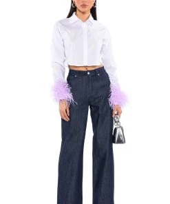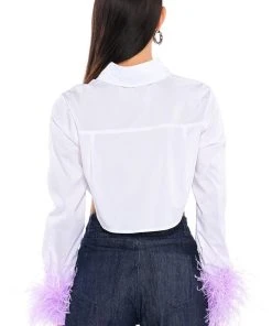 Fly away to fashion paradise with The AKIRA Label Feathers On My Mind Cropped Poplin Shirt With Feathers! This fluttering top is made from a poplin shirt fabrication and features a collared neckline, long sleeves with opulent ostrich feather-detailed wrists, a cropped silhouette, rounded hem, and a button down front closure with a covered placket. Style this top with a pair of fitted trousers and stiletto pumps to complete your chic look.