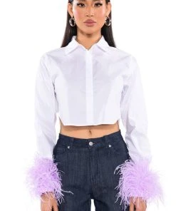 Fly away to fashion paradise with The AKIRA Label Feathers On My Mind Cropped Poplin Shirt With Feathers! This fluttering top is made from a poplin shirt fabrication and features a collared neckline, long sleeves with opulent ostrich feather-detailed wrists, a cropped silhouette, rounded hem, and a button down front closure with a covered placket. Style this top with a pair of fitted trousers and stiletto pumps to complete your chic look.