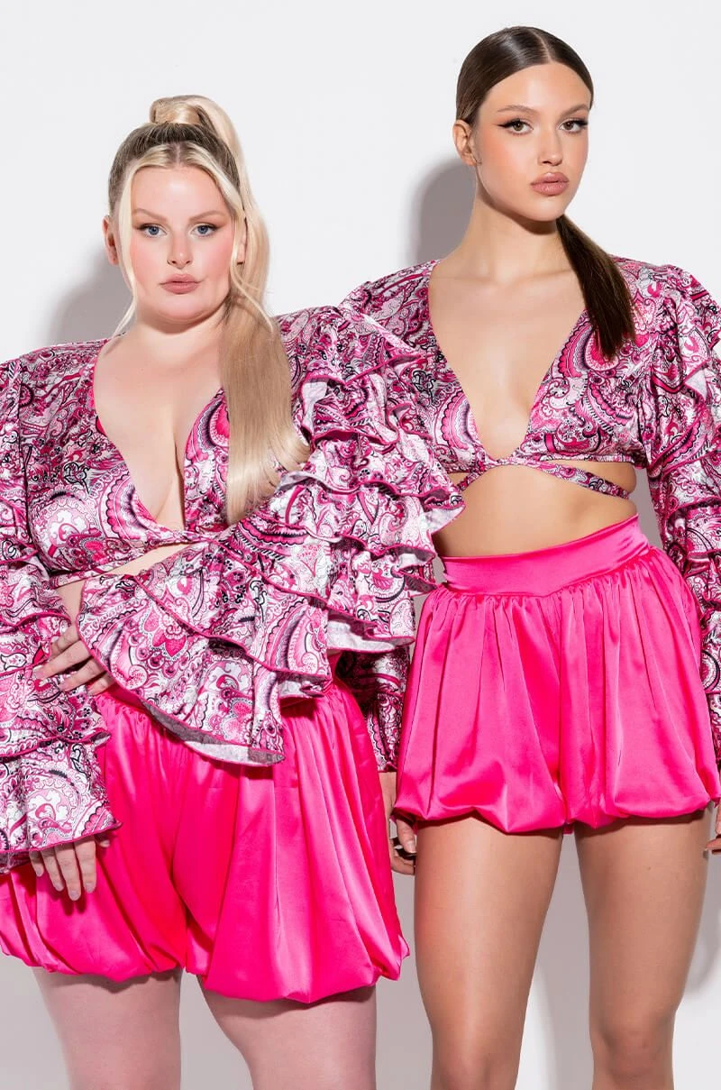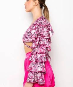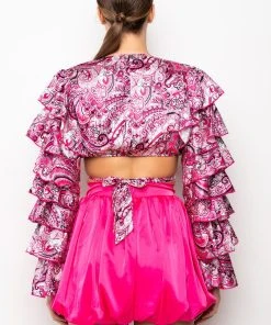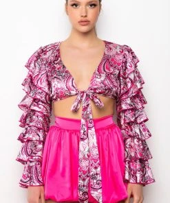 The AKIRA Label Feeling Groovy Tie Front Ruffle Sleeve Blouse is made from a satiny fabrication and features a multicolor paisley pattern, a plunging neckline, tie front design, long bell sleeves with layered ruffle detailing, polyester lining, a thin elastic back band, and a cropped cut. Pair this piece with flared bottoms and booties for a festival-worthy look!