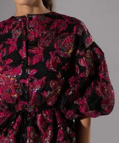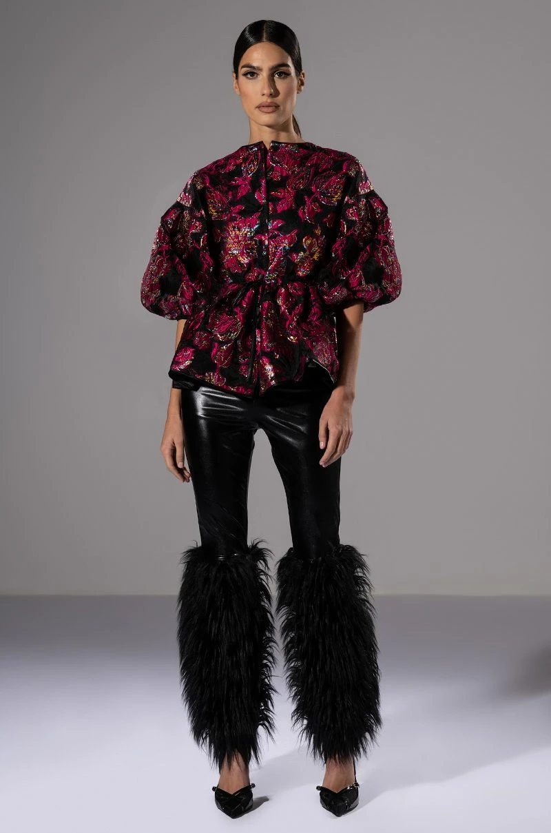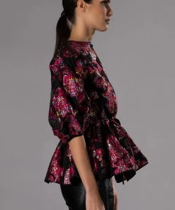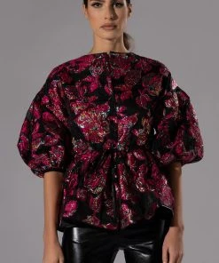 The AKIRA Label Field Of Roses Brocade Blouse is made from a metallic, floral-embossed brocade fabrication and features a high, rounded neckline, long, billowing sleeves, a drawstring waist, slick polyester lining, and a peplum hem. Complete with button down front closures.