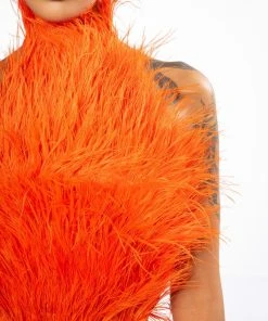 The AKIRA Label Genuine Ostrich Feather Sleeveless Cropped Halter Blouse in Orange is made from a stretchy mesh fabrication and features layered opulent ostrich feathers throughout, a halter neckline with back button detailing, a sleeveless silhouette, an elastic hem, a sexy open back, and a cropped length. Complete with an exposed back zipper closure. Pair this piece with satin bottoms and pumps to complete your look.