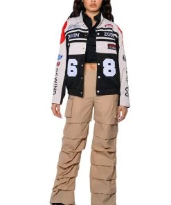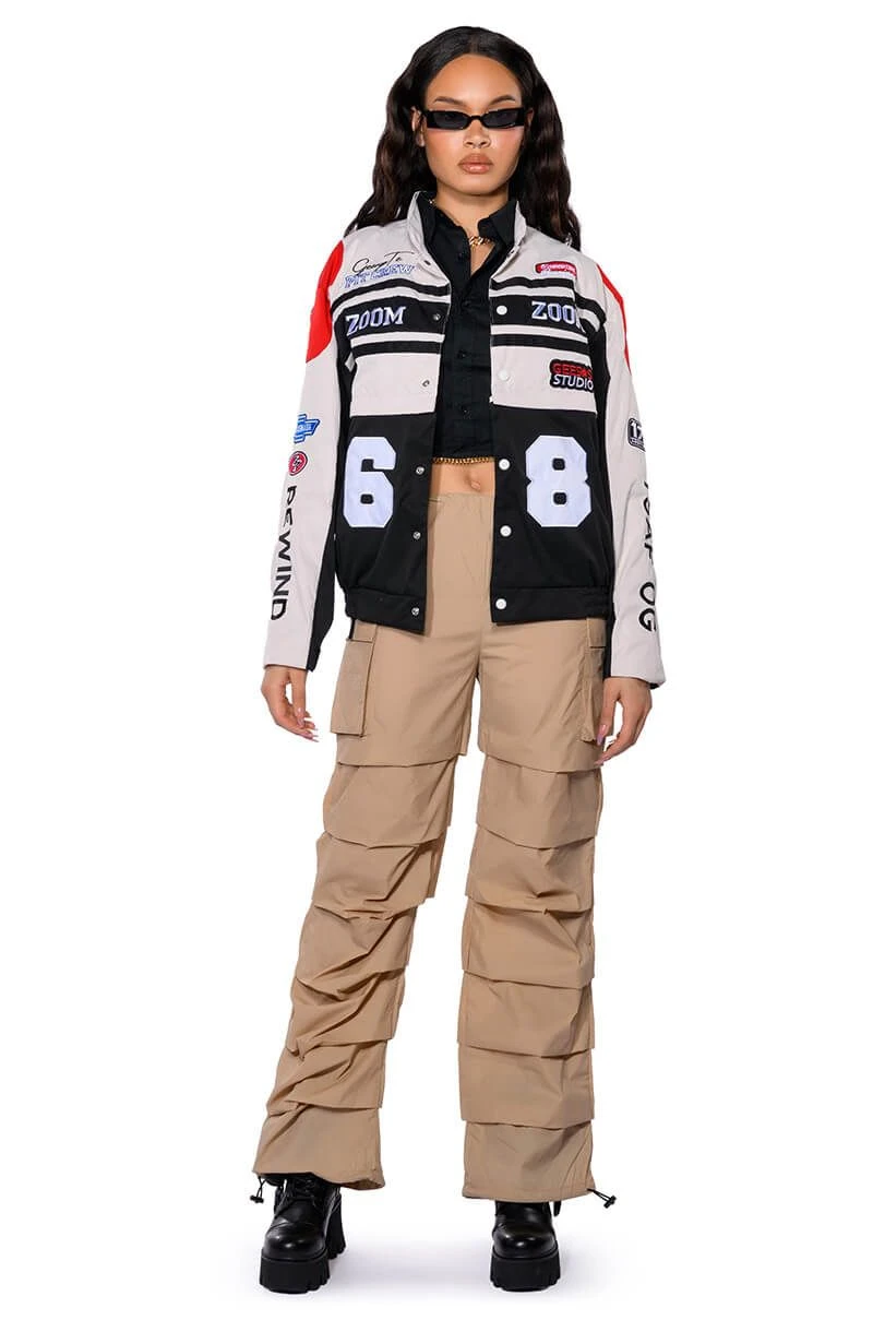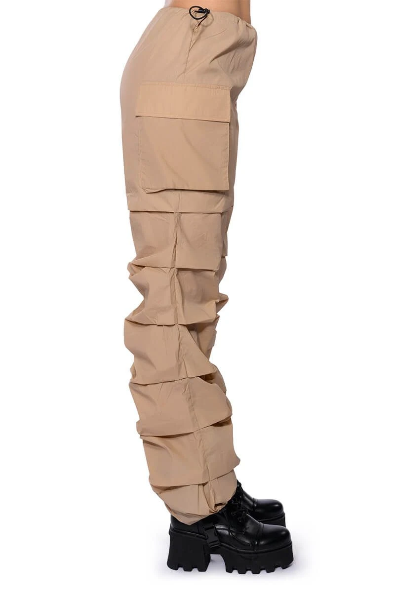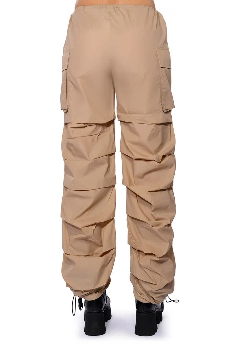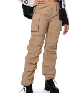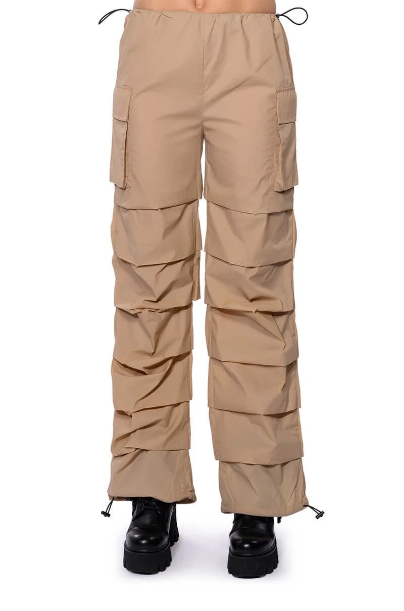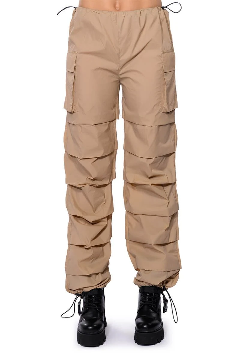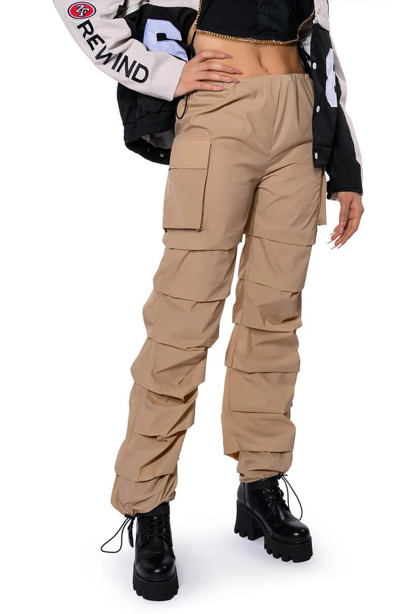 The AKIRA Label Get Down Ruched Parachute Pant features a lightweight, nylon base fabrication, a mid rise toggle drawstring waist, side flap pockets, a wide leg, relaxed fit, and cascading, front seam detailing. Complete with adjustable toggle drawstring bottom hems and a parachute-pant fit. Pair this piece with a sleeveless turtleneck and chunky sneakers to complete your look.