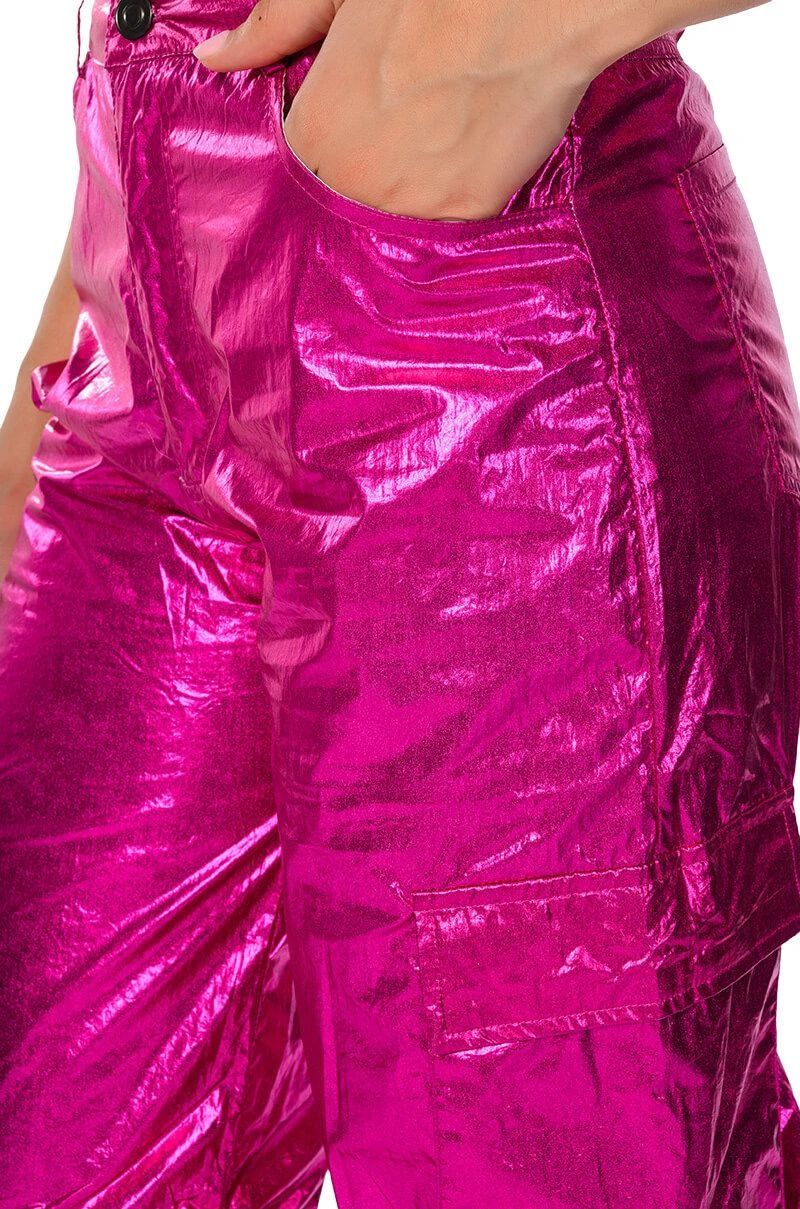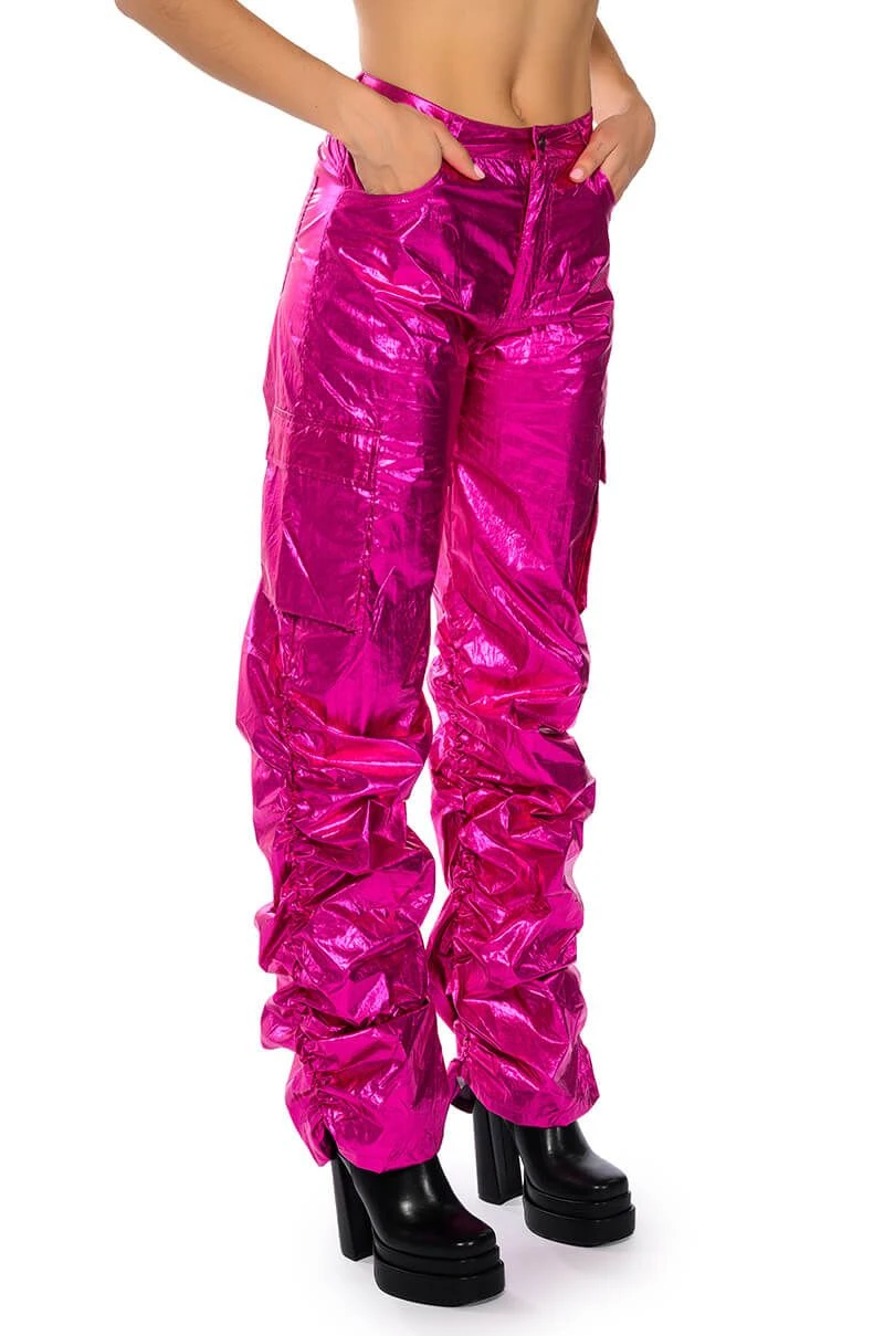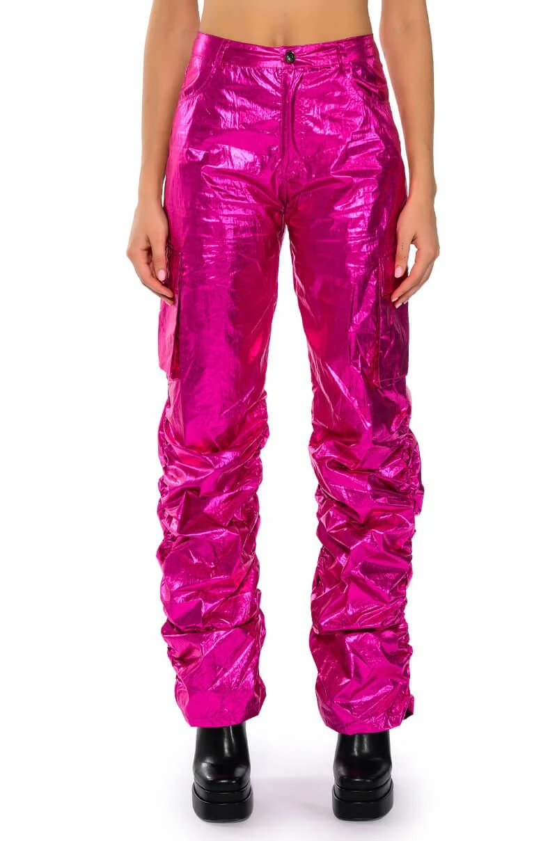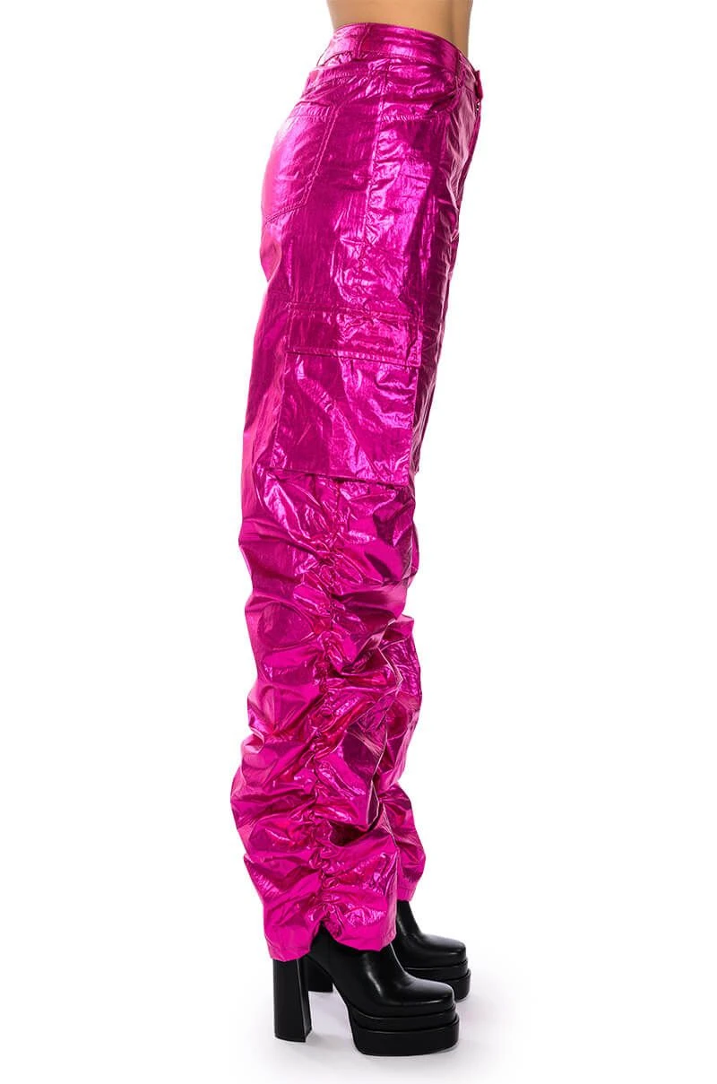 Trendy and sexy, The AKIRA Label Glimpse of Magic Relaxed Metallic Pant is a lightweight fabricated, metallic bottom featuring a high waist rise, a zipper fly button fasten, belt loops, cargo flap side pockets, working back pockets, and a straight leg fit. Complete with ruched side detailing. Pair with your favorite bodysuit and strappy stilettos to complete the look.