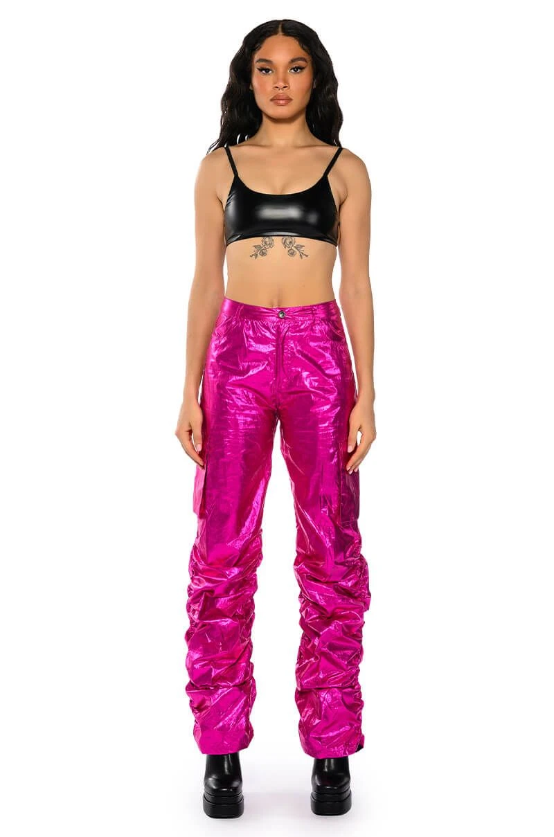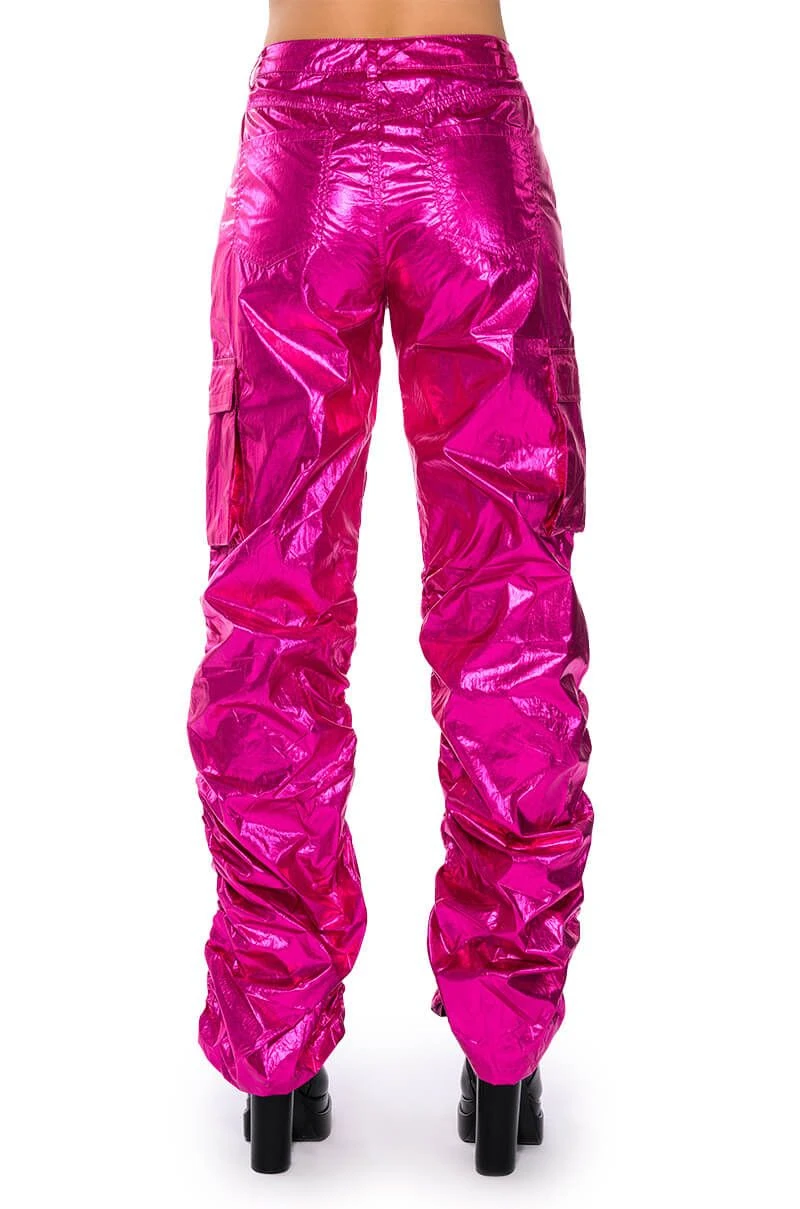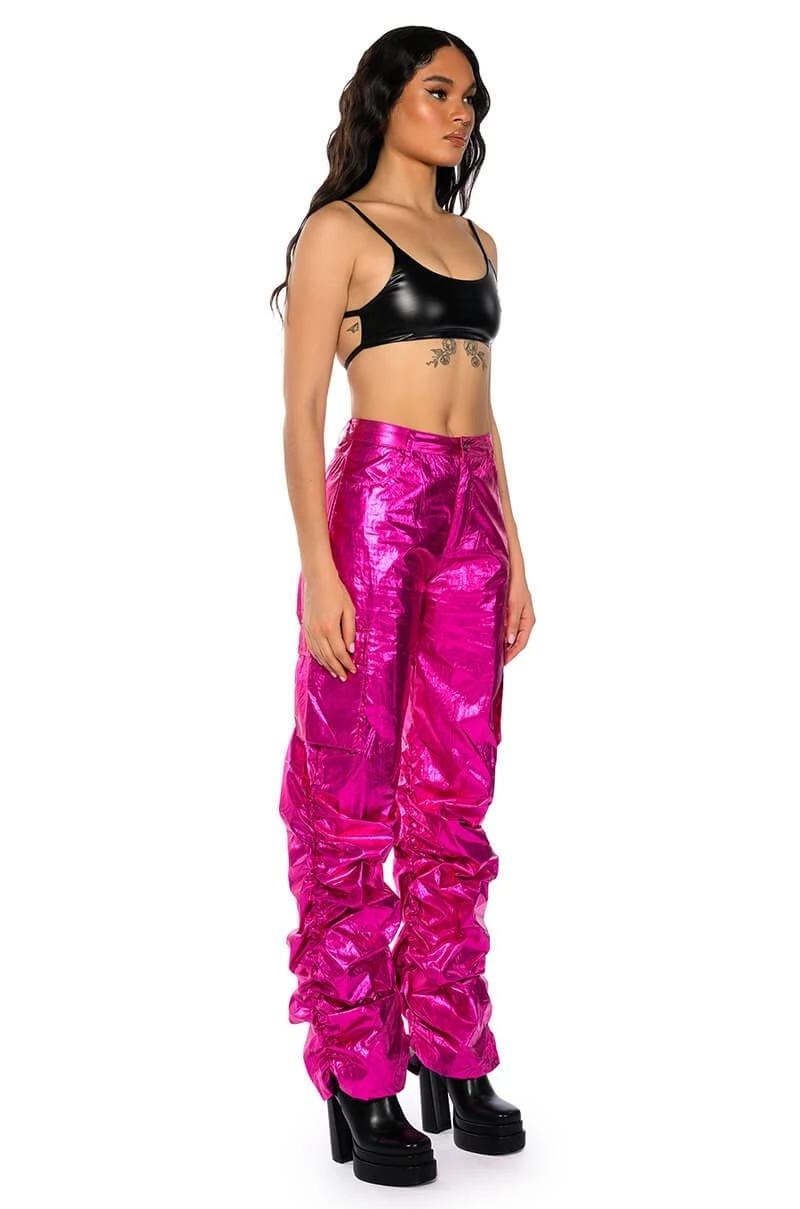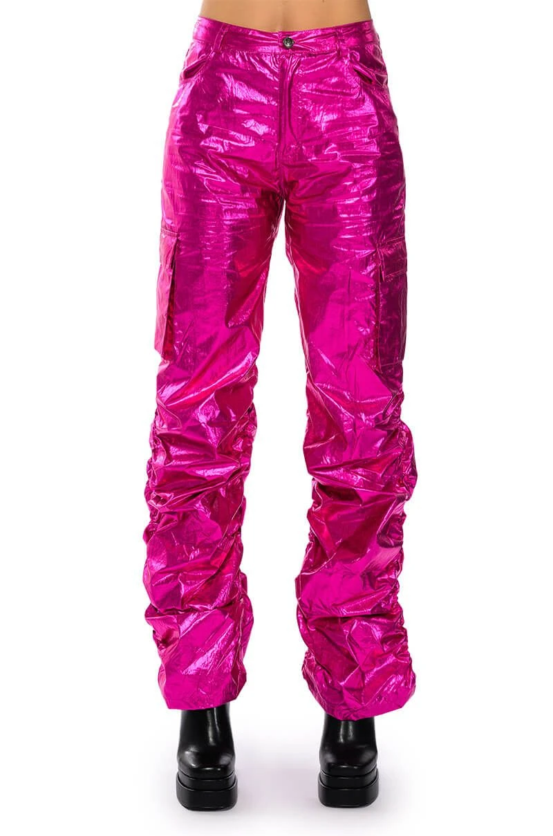 Trendy and sexy, The AKIRA Label Glimpse of Magic Relaxed Metallic Pant is a lightweight fabricated, metallic bottom featuring a high waist rise, a zipper fly button fasten, belt loops, cargo flap side pockets, working back pockets, and a straight leg fit. Complete with ruched side detailing. Pair with your favorite bodysuit and strappy stilettos to complete the look.