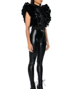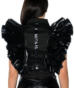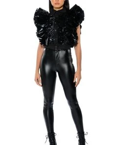 The AKIRA Label Greatest Show Ruffle Button Down Blouse is made from a structured cotton fabrication and features a collared neckline, glossy ruffle body detailing, dramatic ruffle cap sleeves, a slightly cropped silhouette, and snap button down front closures. Pair this piece with skinny pant boots and gloves to complete your show stopping look.