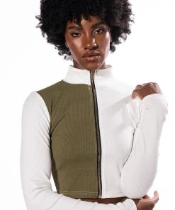 Sweet as cream, The AKIRA Label Half N Half Zipper Top is made from a soft ribbed knit fabrication and features a mock neckline, long sleeves, a colorblock panel, a cropped silhouette, and a front zipper closure. Pair this piece with the coordinating AKIRA Label Half N Half Zipper Skirt and booties to complete your look.