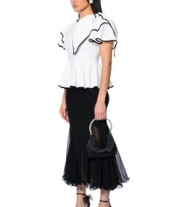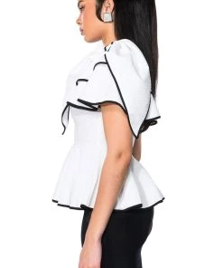 The AKIRA Label Heaven Sent Short Sleeve Peplum Blouse is made from a lightweight textured fabrication and features a crew neckline, short flouncy layered sleeves, a large bow applique on the shoulder, and a peplum hem. Complete with contrast lined hems and a concealed back zipper closure. Pair this piece with wide leg bottoms and mules for a sweet, heavenly look.