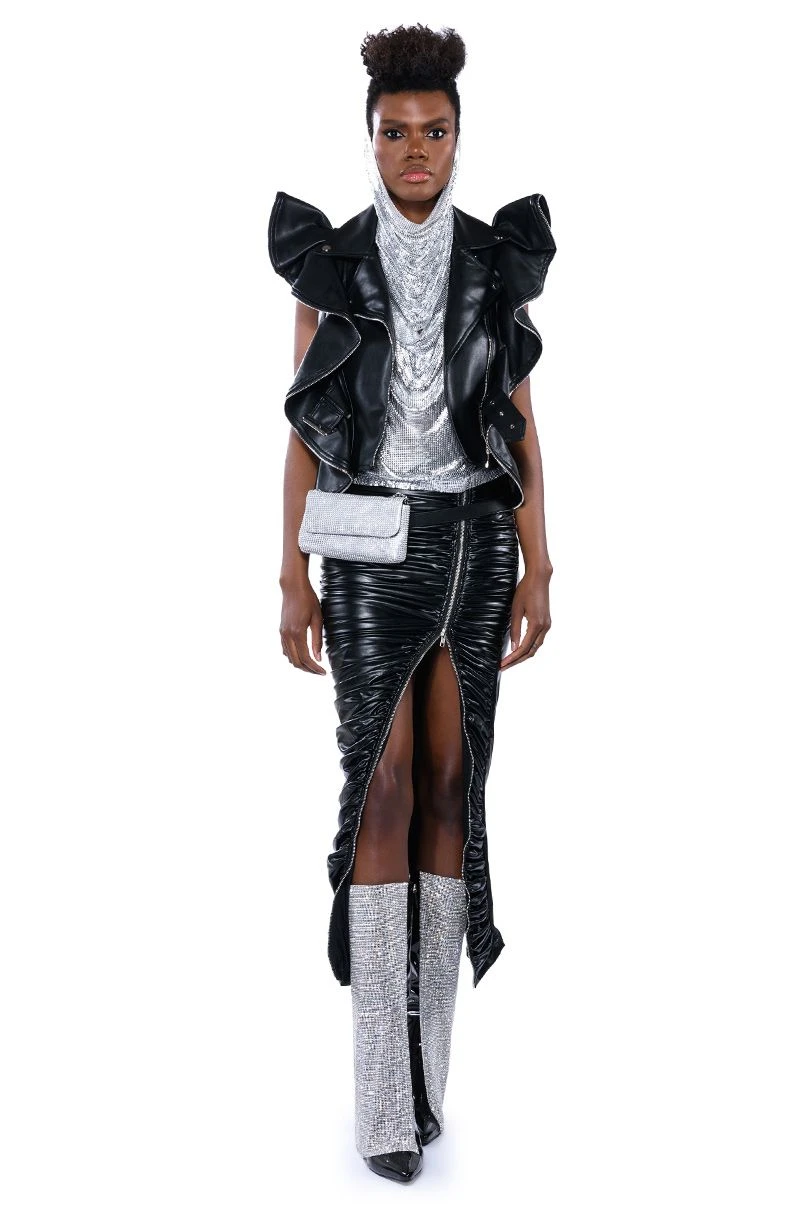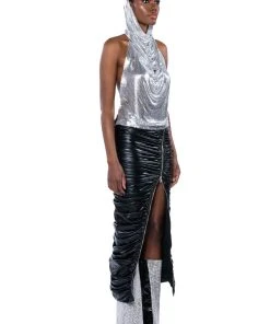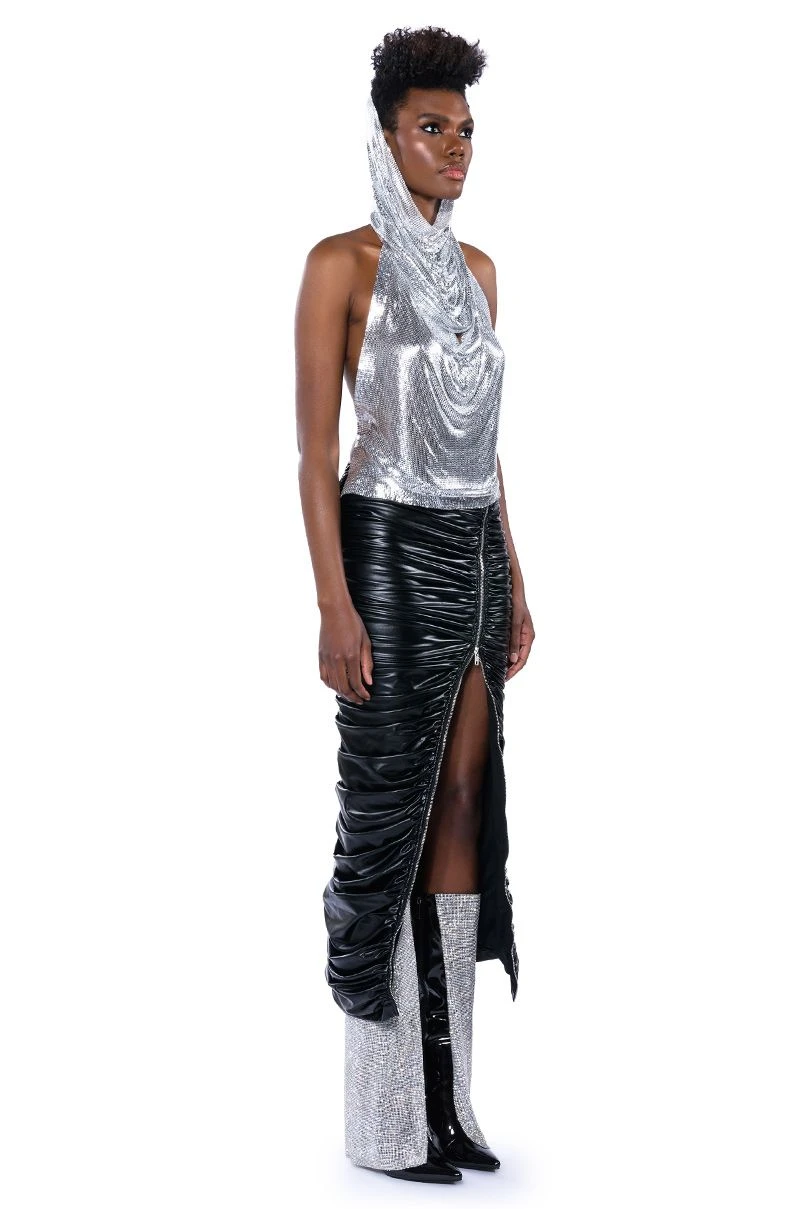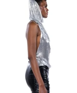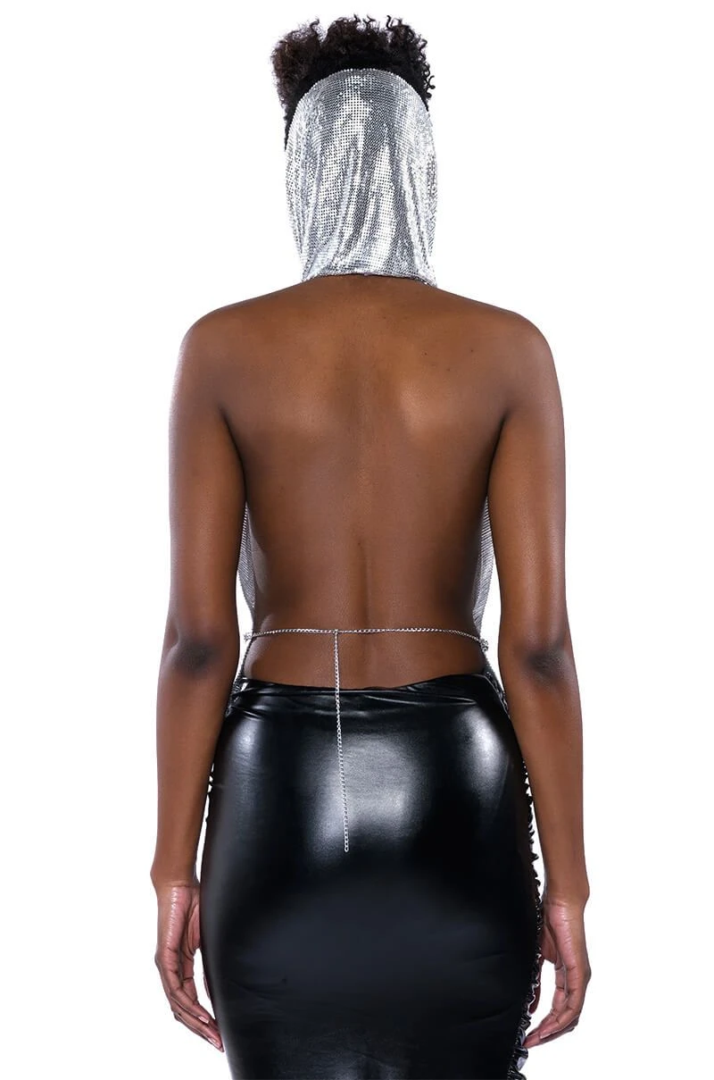 Make your dreams reality in The AKIRA Label In My Mind High Sine Hooded Chainmail Top. This metallic chainmail piece features a sleeveless silhouette, a cowl neckline, a waist length cut, and a sensual backless design. Complete with an elegantly draped attached hood, a chain link back strap, and a lobster claw clasp closure. Pair with distressed denim and pointy toe pumps for a complete look.