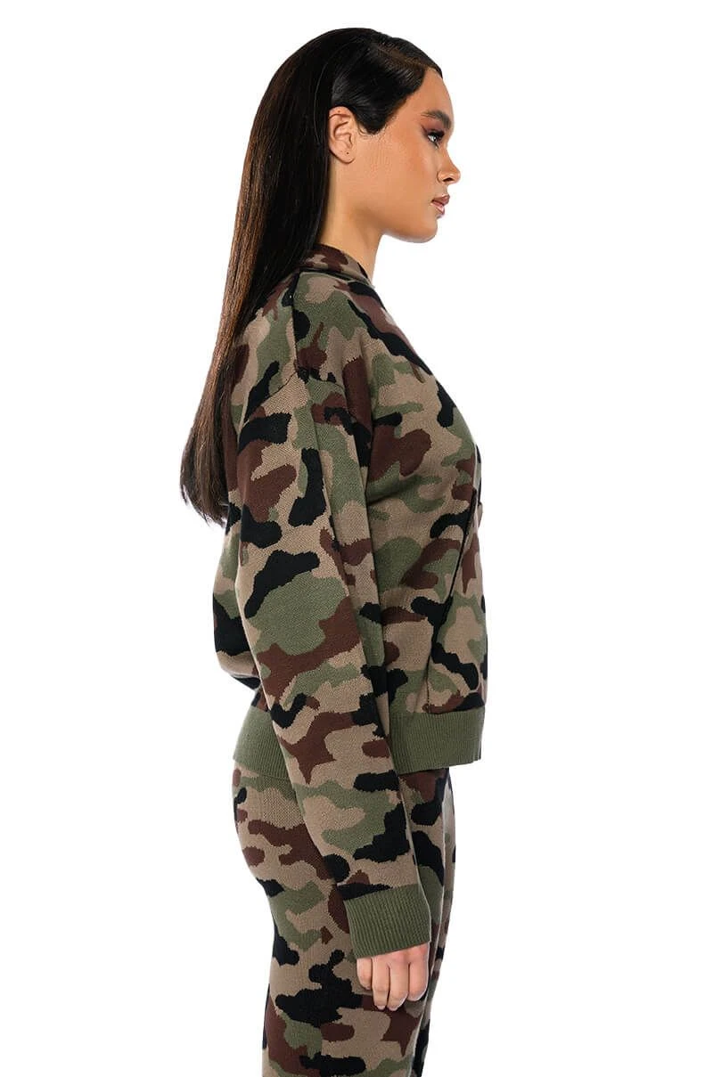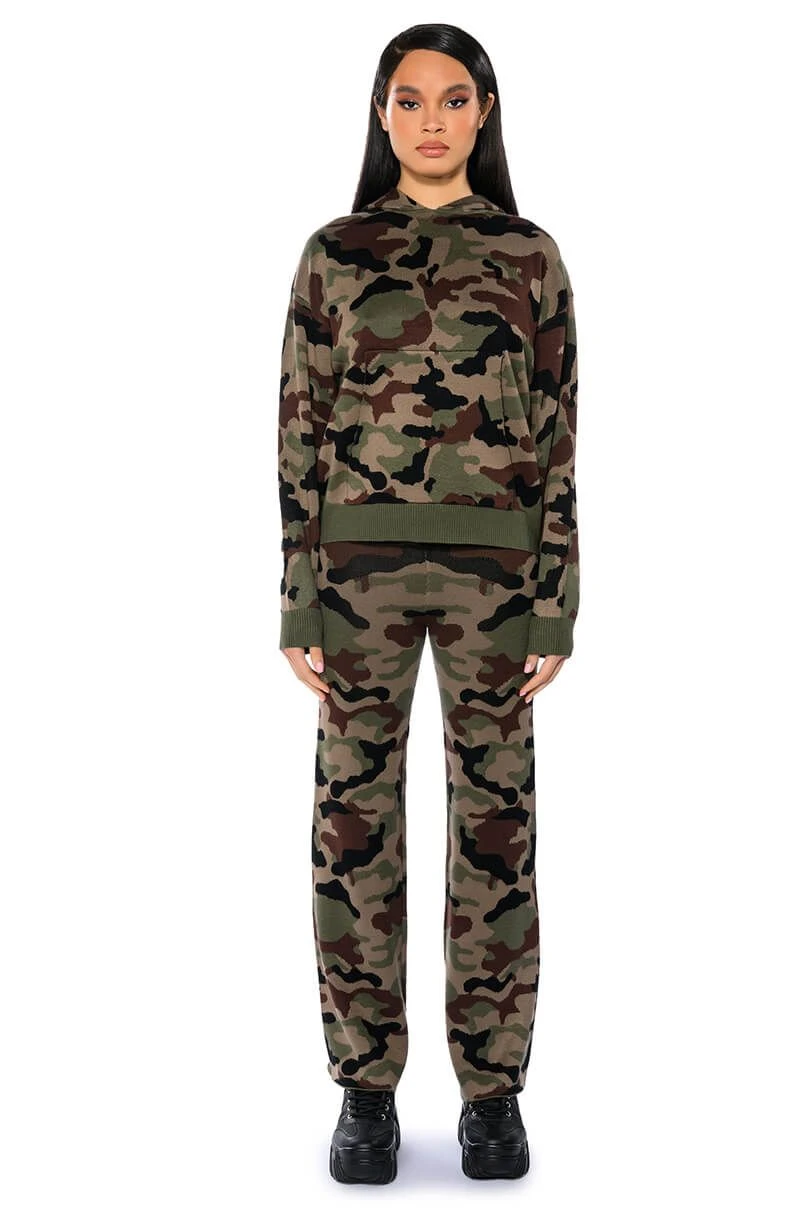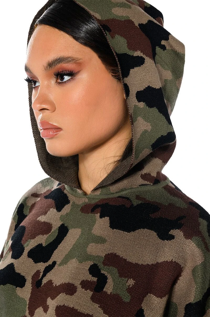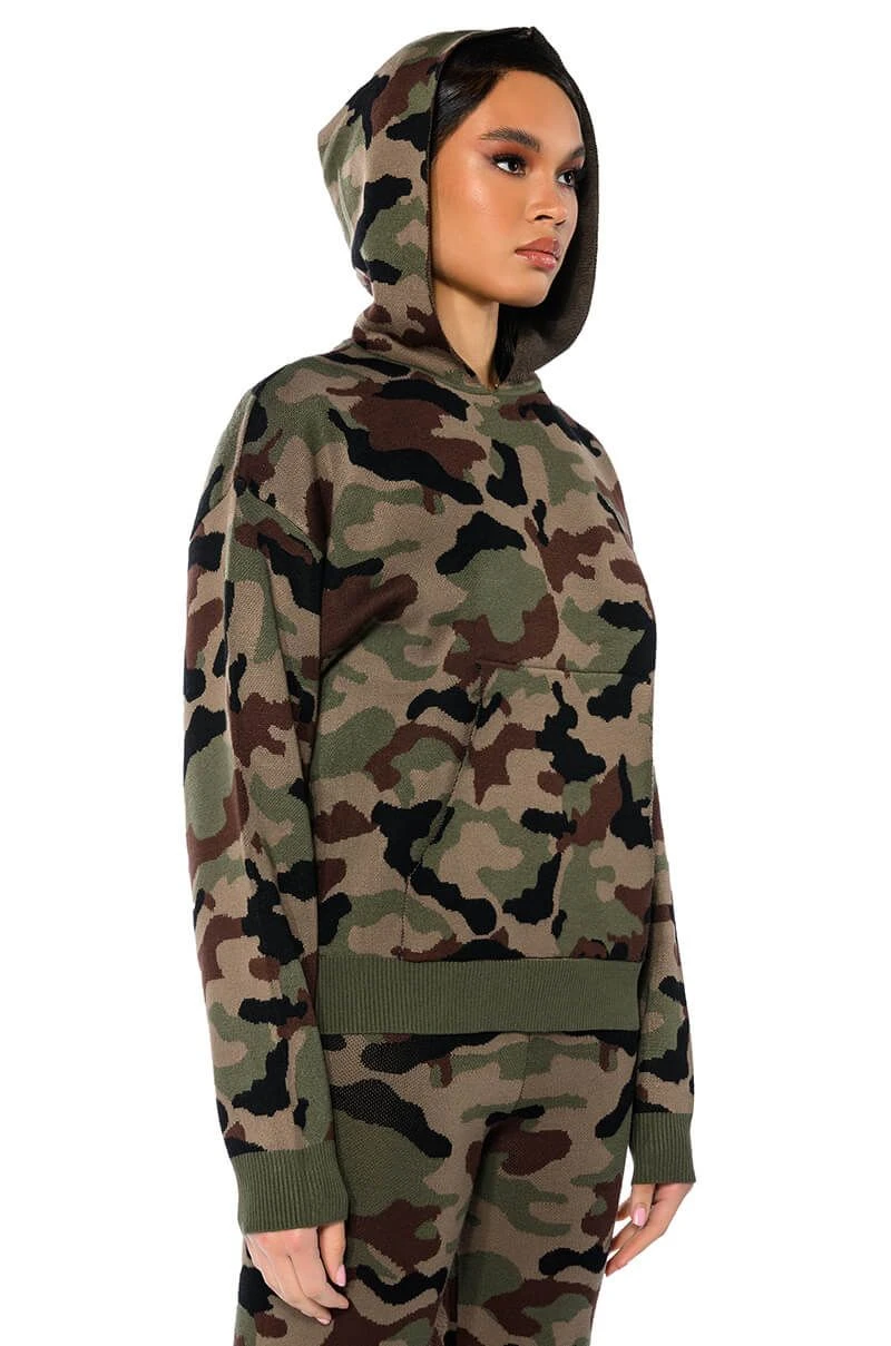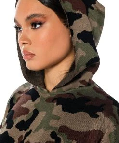 The AKIRA Label Incognito Mode Knit Hoodie is made from a soft knit fabrication and features a graphic camo print, an attached hood, long sleeves, a front kangaroo pocket, a boxy silhouette, and ribbed knit hems. Pair this piece with the matching AKIRA Label Incognito Mode Knit Wide Leg Pant to complete your look.