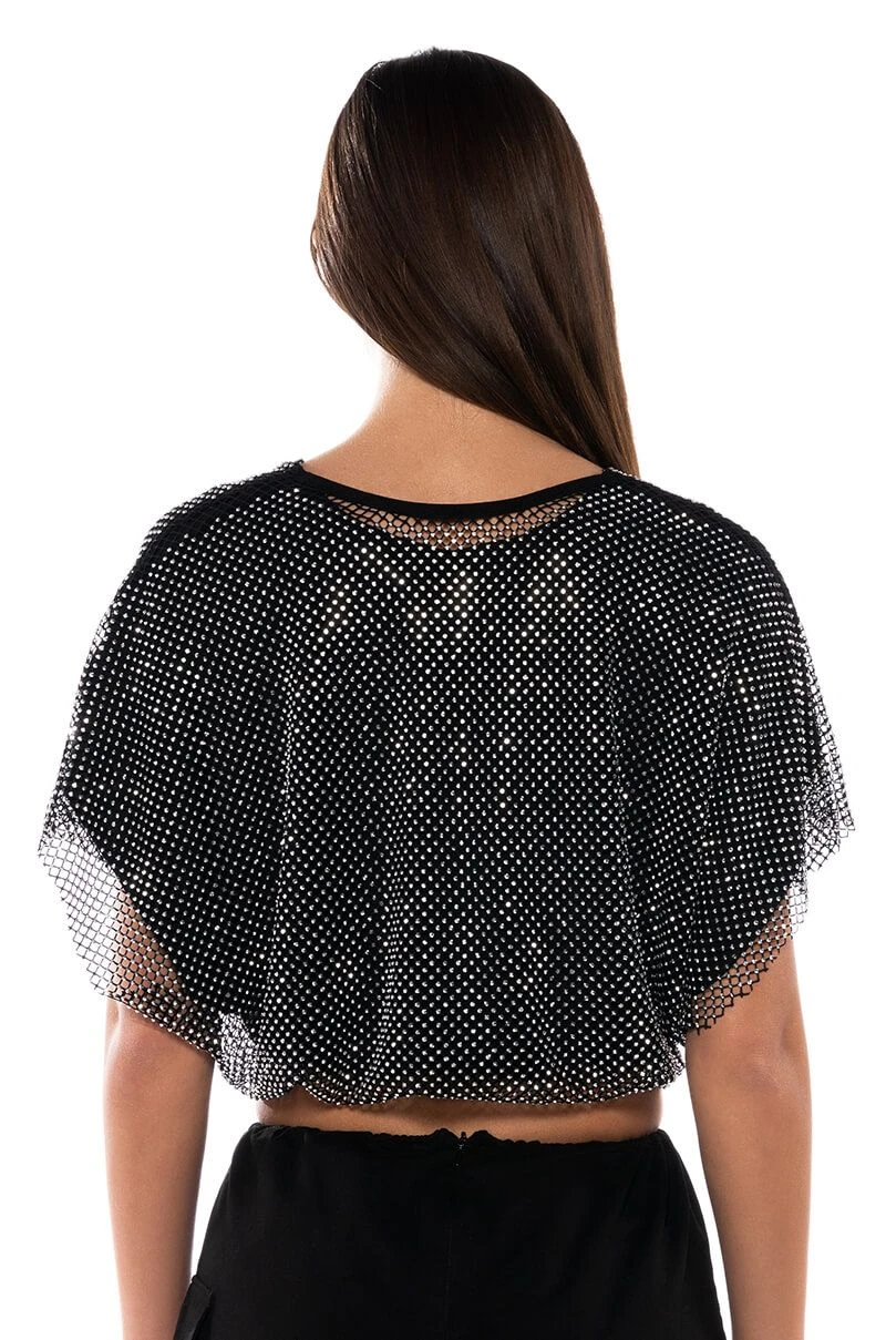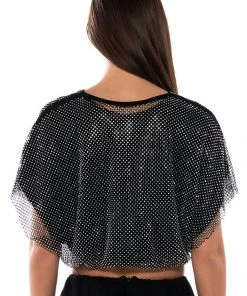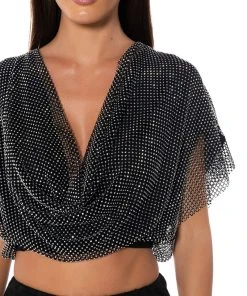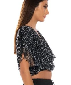 The AKIRA Label Indigo Draped Rhinestone Mesh Blouse In Black is made from a soft, stretchy base fabrication and features a plunging cowl neckline, short sleeves, ruched elastic waistband, and a cropped silhouette. Complete with a glimmering, rhinestone embellished layered mesh and a slip-on fit. Style with wide leg satin wide leg bottoms and kitten heels.