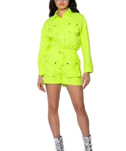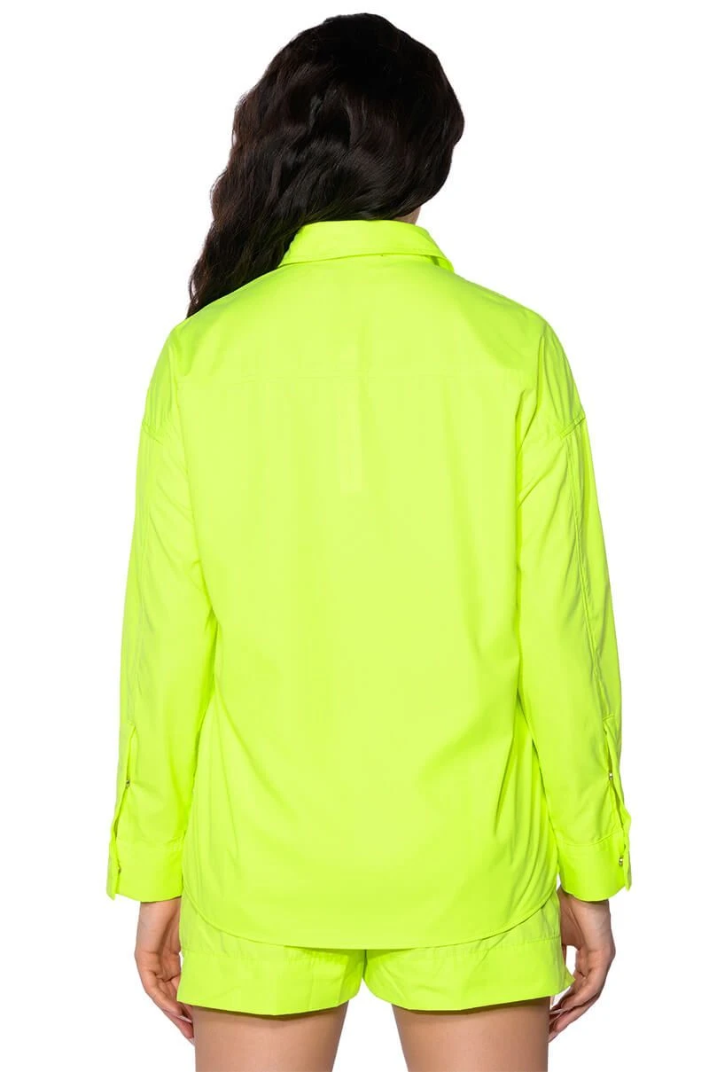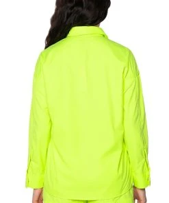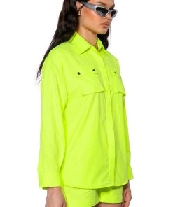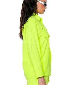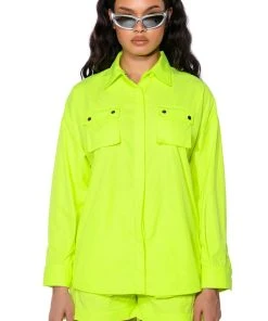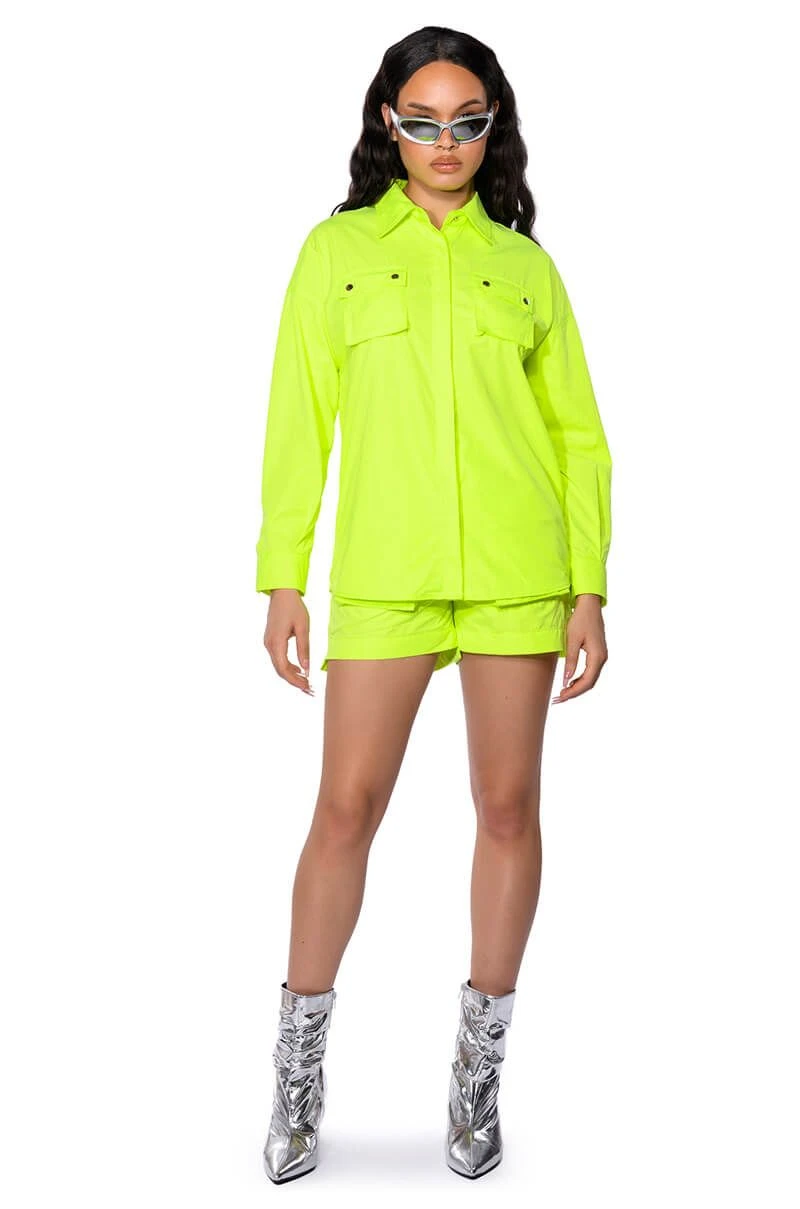 The AKIRA Label Kai Button Down Shirt is part of a flowy chic two-piece set, made from a lightweight, neon base fabrication. It features a pointed foldover collar, long sleeves with buttoned cuffs, snap buttoned flap front pockets with silver metallic detail, and a button down front closure. Complete with an oversized, long line silhouette. Style with the coordinating bottoms, The AKIRA Label Kai Pull On Shorts, and chunky boots for a bold, everyday look.