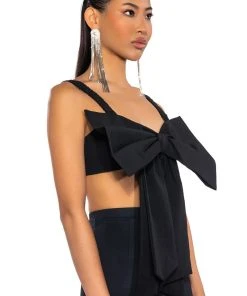 Take your date-night look to the next level with The AKIRA Label Kyle Bow Detail Bralette! This sexy, chic number is a bralette made from a smooth base fabrication, featuring ruched elastic tank straps, a large ribbon bow-tie front, and an inner lining at the cups. Complete with a shirred elastic back and a metallic silver zipper closure. Style with wide-leg dress pants and sleek stilettos for that femme fatale look.