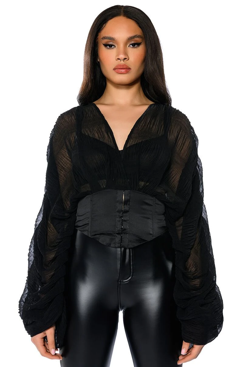 Embrace your inner goddess in The AKIRA Label Leilani Corset Detail Blouse! This top is made from a soft, sheer pleated fabrication and features a plunging neckline and long ruched sleeves. Complete with a sexy satin pointed corset with hook-and-eye front closures, and a pleated elastic waistband at the back. Pair with a mini skirt and strappy sandals, or straight leg denim and heeled boots – the styling possibilities are endless!