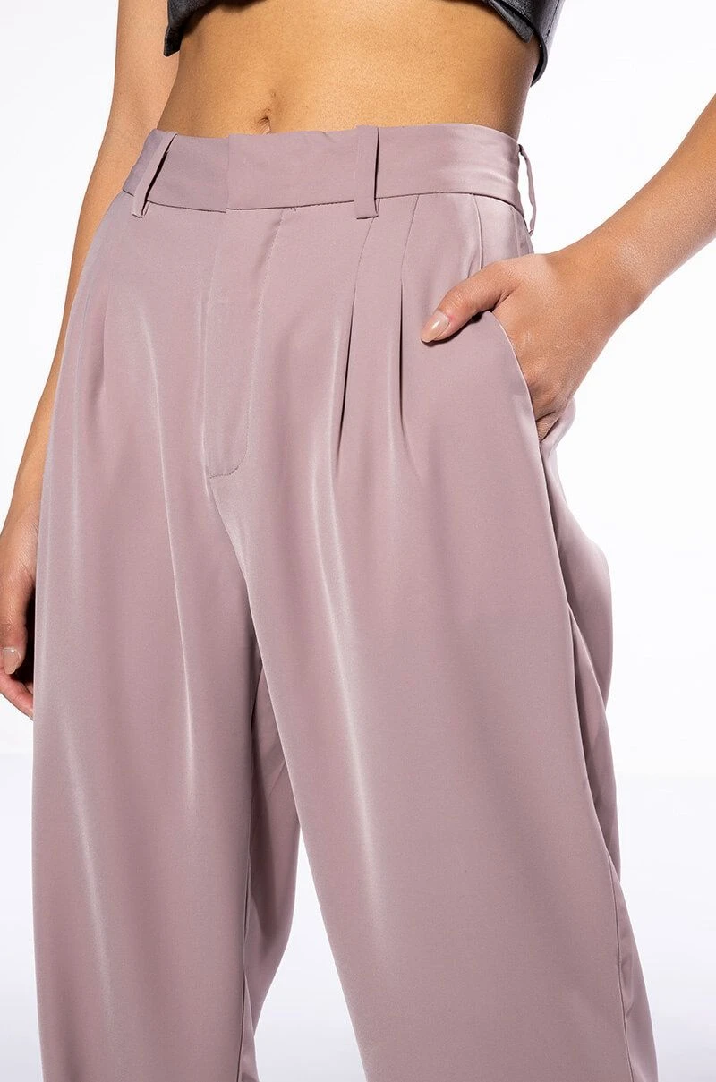 The AKIRA Label Logan Wide Leg Trouser In Taupe is made from a slick, lightweight fabrication and features a high rise waist, a wide waistband, working belt loops, slant side pockets, pleated stitching, jetted back pockets, and a wide leg silhouette. Complete with a double clasp and zipper front closure. Pair this suited-up piece with a mock neck top and pumps to complete your tailored look.