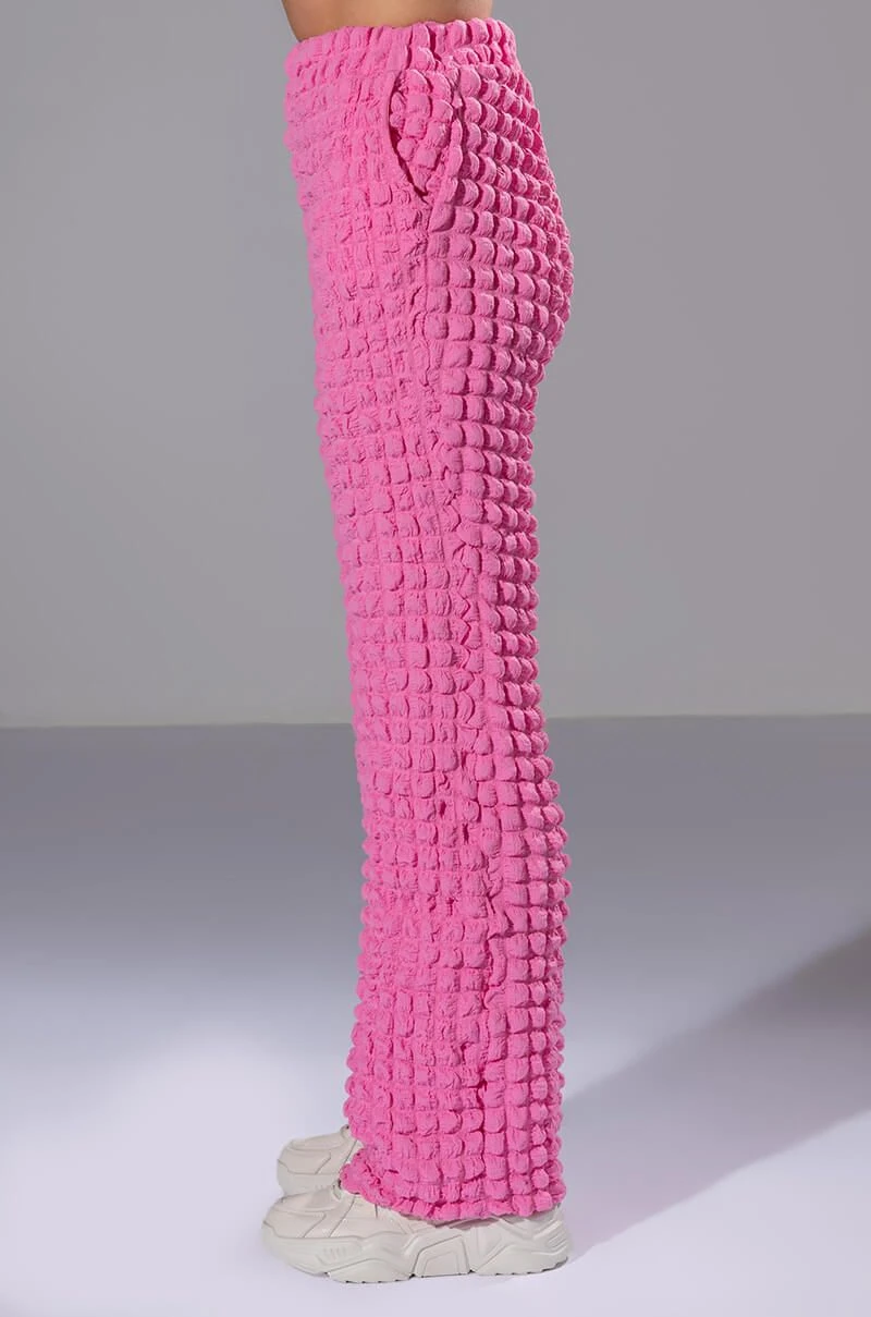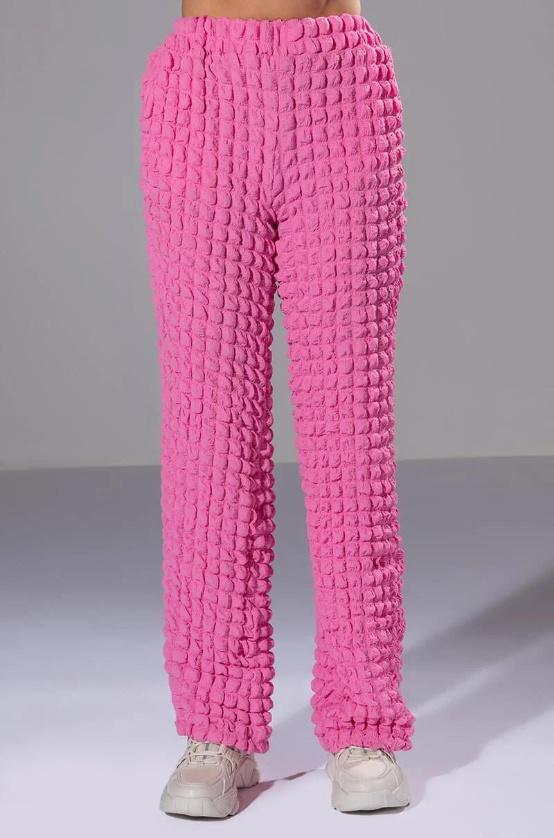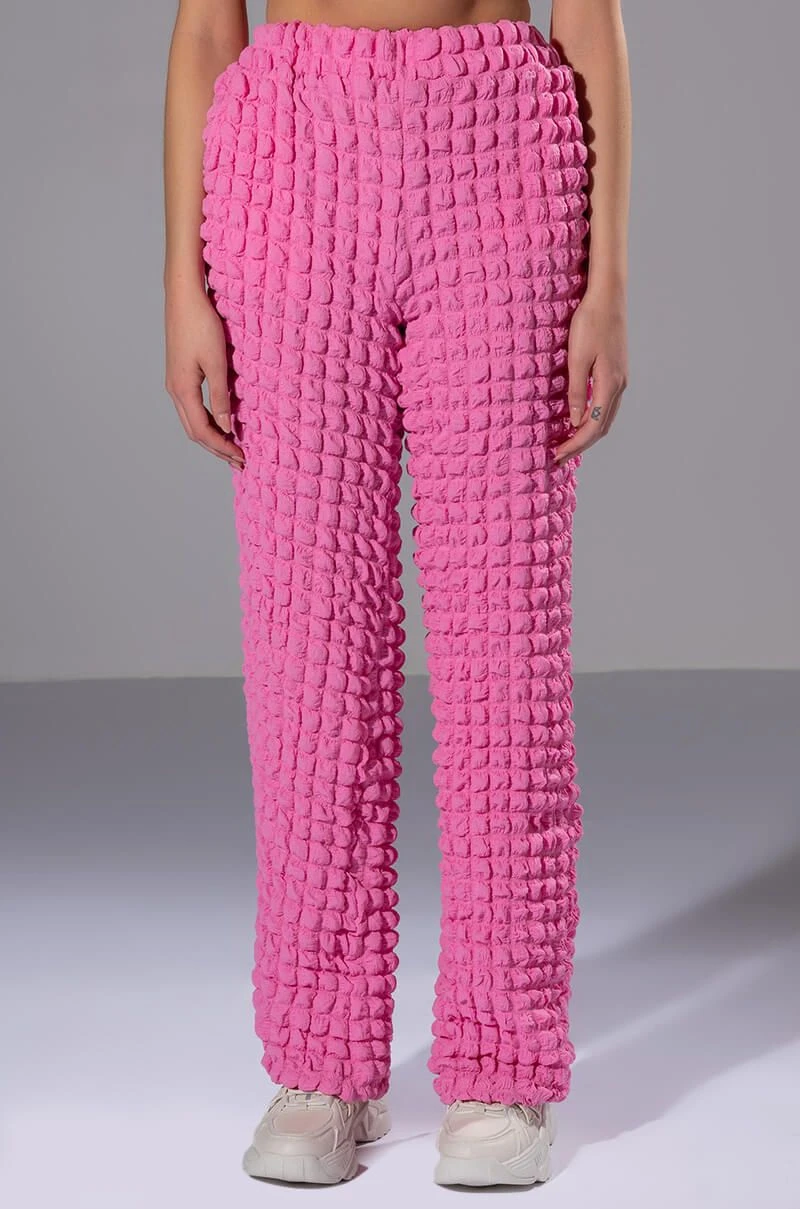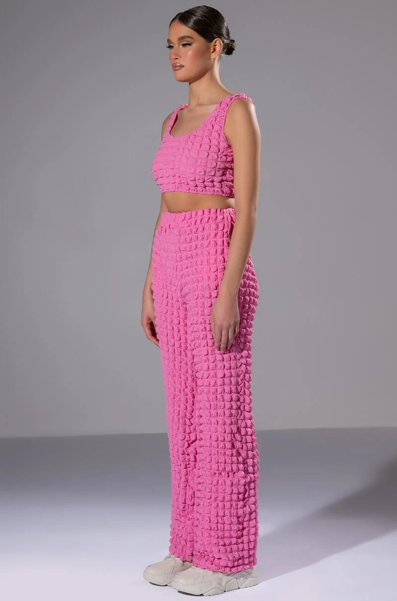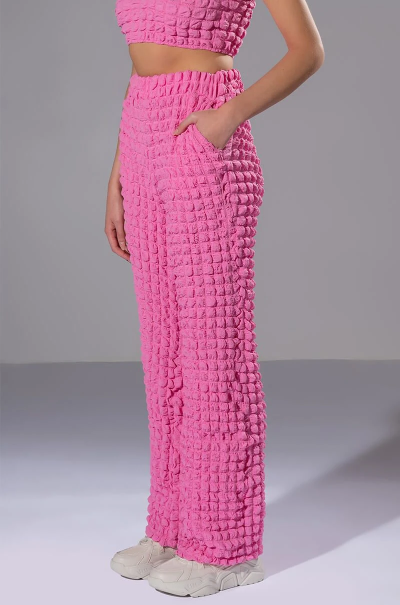 The AKIRA Label Lucy Textured Wide Leg Pant is made from a stretchy popcorn fabrication and features a high rise waist, a wide elastic waistband, slant side pockets, a wide leg silhouette, and a pull-on fit. Pair this piece with the matching AKIRA Label Lucy Textured Button Down Blouse and Lucy Textured Crop Tank Top to complete your look.