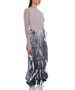 The AKIRA Label Macy Faux Denim Look Parachute Pant is made from a lightweight, sleek base fabrication and features a dark wash denim graphic print design. Complete with a dual toggle drawstring waist, a wide leg, parachute pant silhouette, and drawstring toggles at the bottom hems. Style with baby tees or bodysuits, chunky boots, and a statement piece hat, for an effortlessly iconic look.