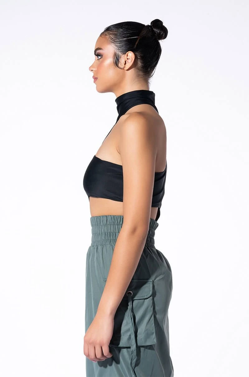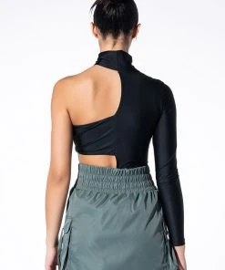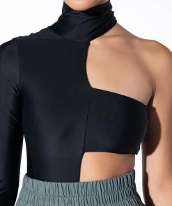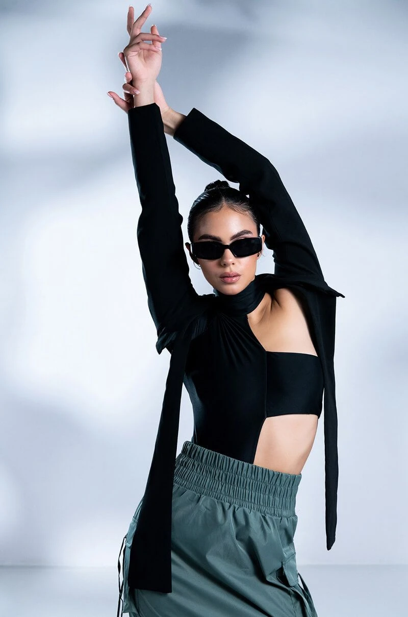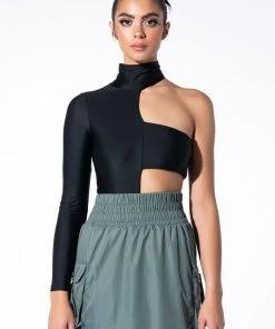 The AKIRA Label Mia Bandeau Detail Mock Neck Bodysuit is made from a slick, stretchy fabrication and features a mock neckline, a long sleeve, and a sexy bandeau bodice detail. Complete with a cheeky bottom fit and a snap gusset closure.