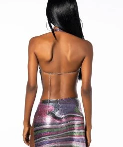 The AKIRA Label Move Your Body High Shine Chainmail Top is made from a multicolor, striped psychedelic print chainmail base and features a halter with hook eye back closures, a plunging cowl neckline, a pointed hem, a handkerchief top design, and an open back with an adjustable chain link lobster claw closure. Style this piece with the coordinating AKIRA Label Move Your Body Chainmail Mini Skirt and platform sandals to complete your look.