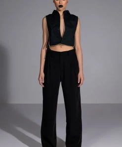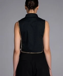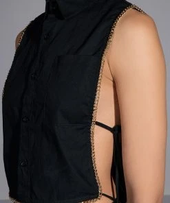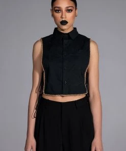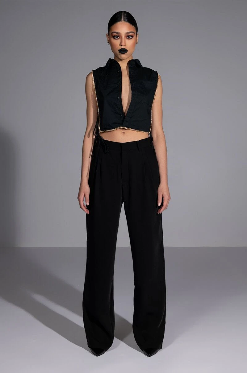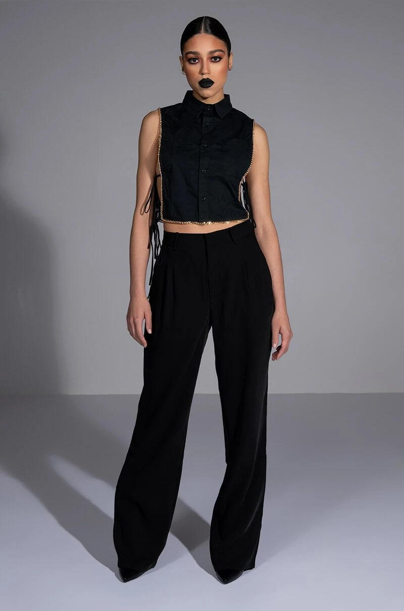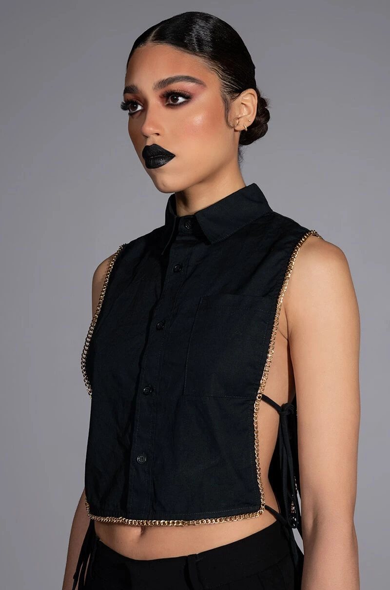 The AKIRA Label My Time Button Down Sleeveless Blouse is a cropped blouse featuring a structured cotton fabrication. a point collar design, a button down front placket, and open side detailing with dual tie up closure. Complete with luxurious faux gold chain link detailing. Style this shirt with a sleek pair of leggings.