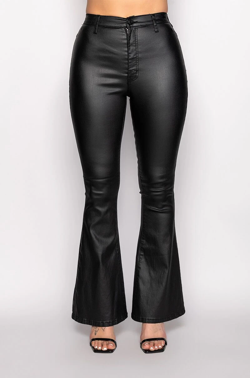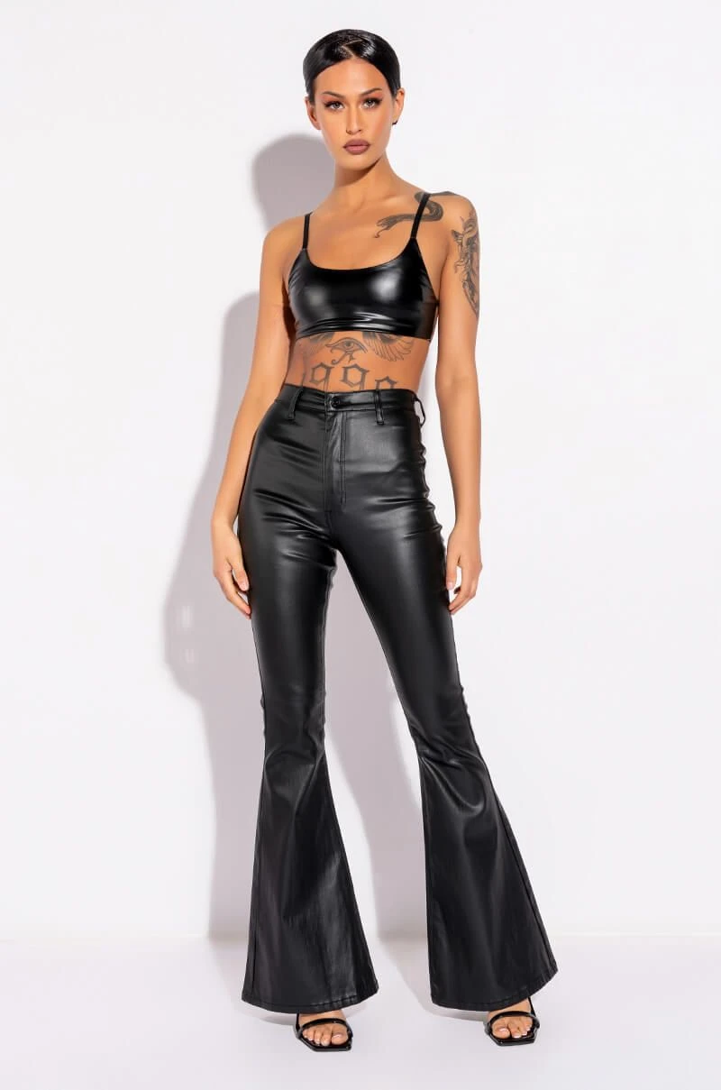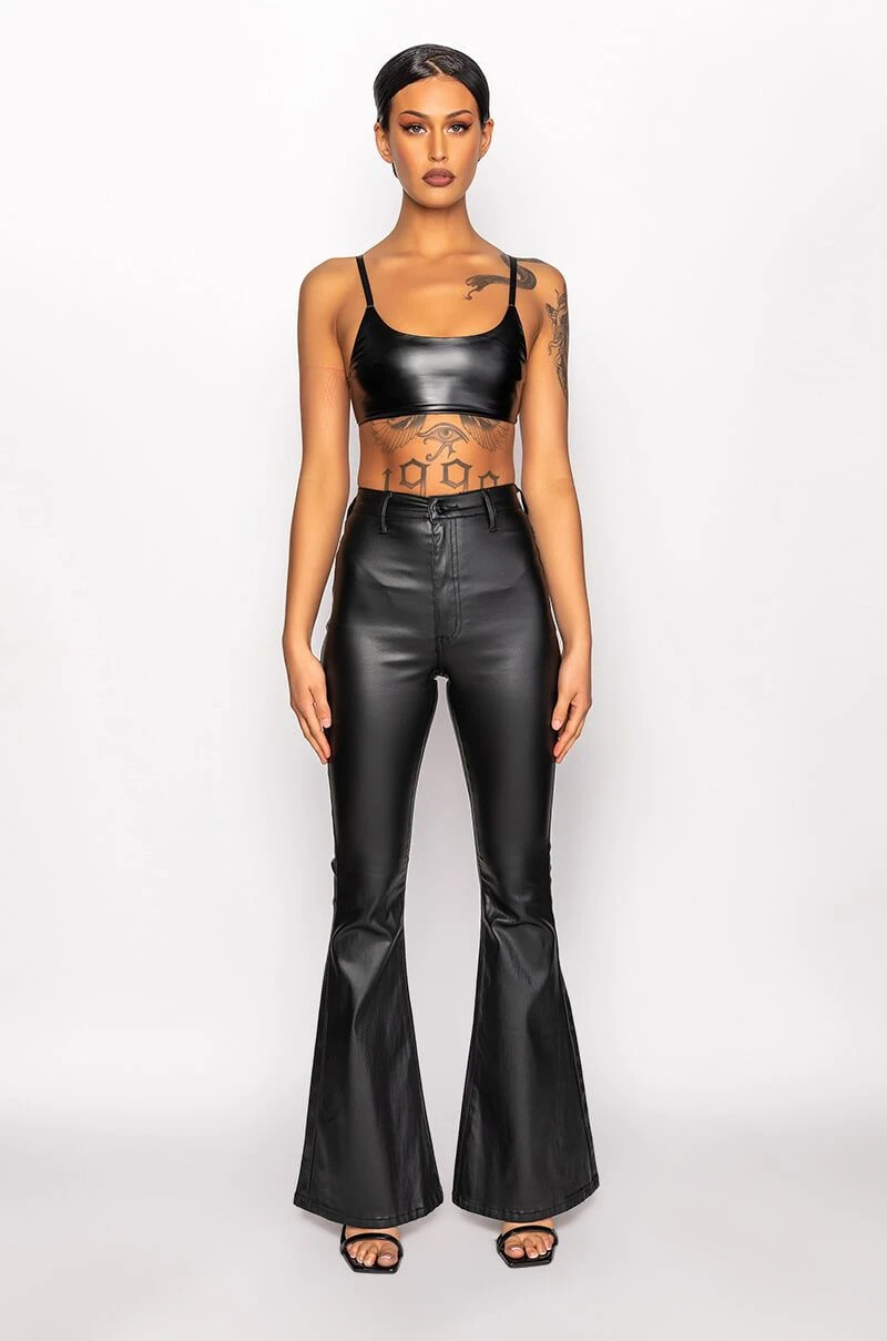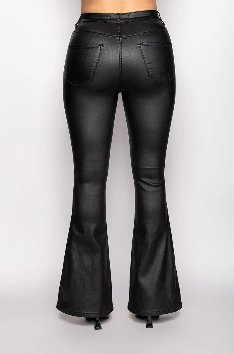 Model on duty vibes. The AKIRA Label On Duty Vegan Leather High Rise Flare Pants are matte faux leather pants that feature a super flattering silhouette. Complete with a high rise waist, belt loops, a button and zip fly, back patch pockets, and flared hems, style these bad boys with a cropped baby tee and stiletto sock booties. Top it off with an oversized blazer and a rhinestone bag.