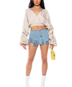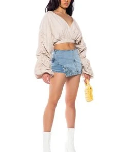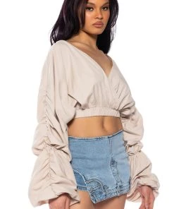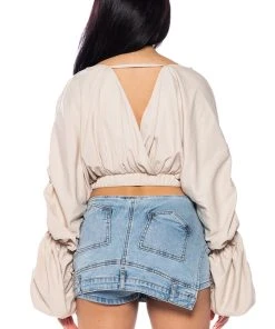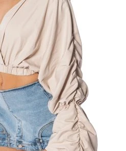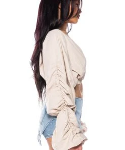 The AKIRA Label Ophelia Ruched Long Sleeve Blouse is made from a smooth, lightweight material and features a wrap front and back design, plunging neckline, long ruched sleeves with ruched elastic hems, and a cropped silhouette, Complete with a triangle open back, elastic waistband, and a slip-on fit. Style with slick, faux leather pants and stiletto pumps for a sexy, chic look.